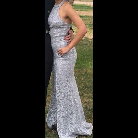 Sparkly silver dress, halter tie with slit on left leg worn once.