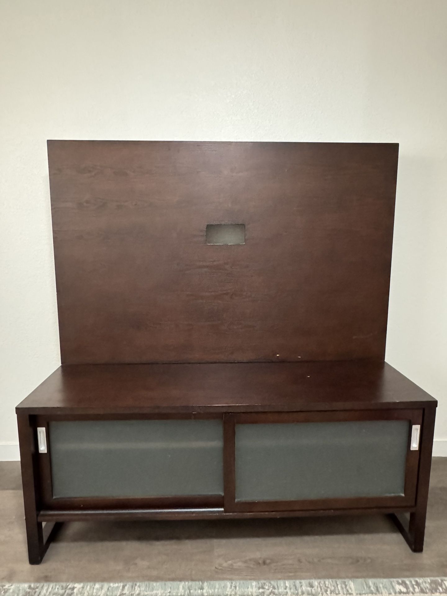 Tv stand from crate and barrel, scratches throughout but looks good. Dark colored wood. The back is removable for easy transport. Comfortably fits a 50” tv. Sliding glass doors at the front. 54” wide x 58” tall x 21” deep Located near Cactus and the 17
