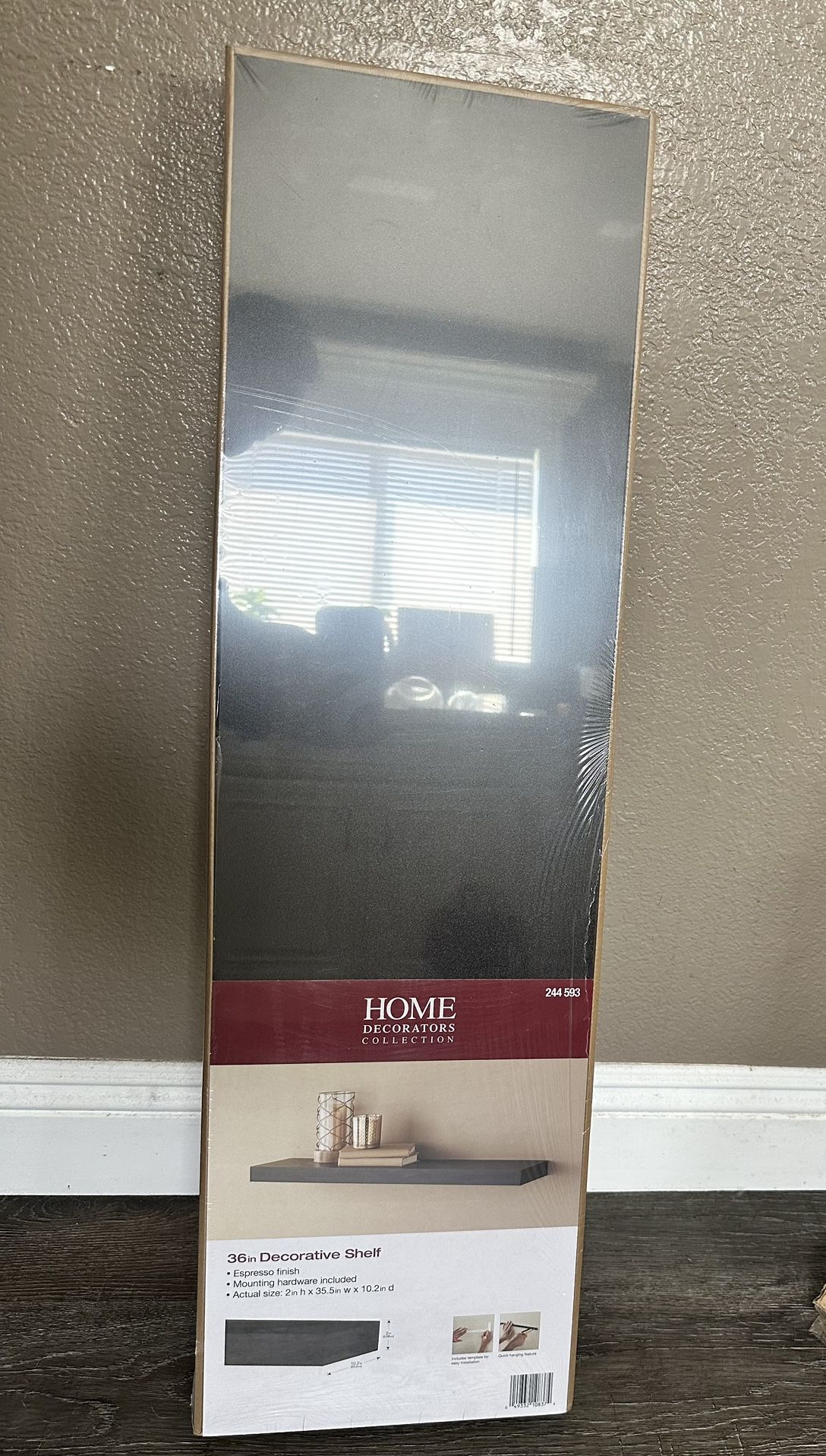 Floating Decorative Wall Shelf Actual size 2in h x 35.5in W x 10.2in D Espresso Finish Mounting hardware included Brand new still seal in box Cash only.