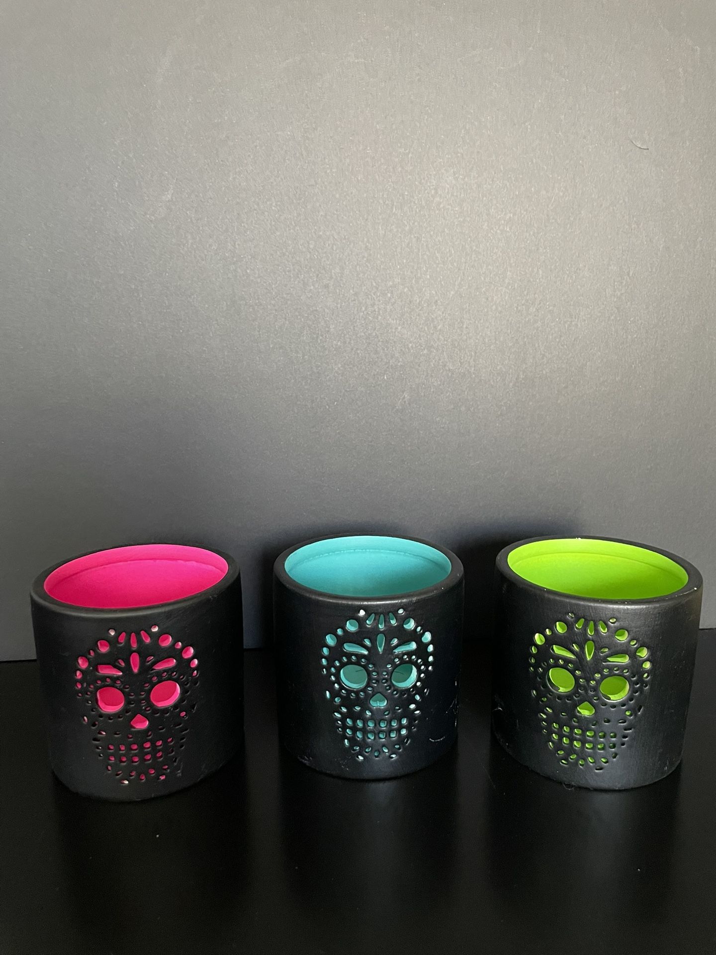 Matte-black ceramic sleeves with laser-cut calavera faces that glow neon pink, teal, or lime when you drop in an LED or real tealight. Each holder measures approx. 3 in H × 3 in Ø—perfect for altars, spooky centerpieces, or mood lighting on Day-of-the-Dead nights. Choose your color or grab the trio for an instant pop of fiesta flair! 💀🕯️