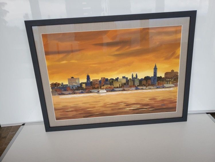 Hidden Treasures on the Brick Road 10003 270th St NW, Stanwood, WA 98292 Open: Fridays 1pm - 4pm & Saturdays 1pm - 6pm Length (inches): 33.00 Width (inches): 1.00 Height (inches): 25.00 This striking framed artwork by Perry Acker features a vibrant cityscape against a dramatic sunset sky, showcasing the artist’s bold use of color and distinctive urban perspective. The rich golden-orange tones of the sky contrast beautifully with the deep blues and earth tones of the city buildings and waterfront, making this piece a captivating focal point for any room. Artist: Perry Acker Title/Subject: Urban Cityscape / Skyline at Sunset Material: Print on paper, professionally matted and framed behind glass Frame Dimensions: 25 inches tall x 33 inches wide x 1 inch deep Style: Contemporary cityscape, urban modern, mid-to-late 20th century American art Age: Estimated late 20th century (c. 1980s–1990s) Condition: Excellent overall – vibrant colors, clean matting, and sturdy black frame with light wear consistent with age and display. Ready to hang with wire backing.