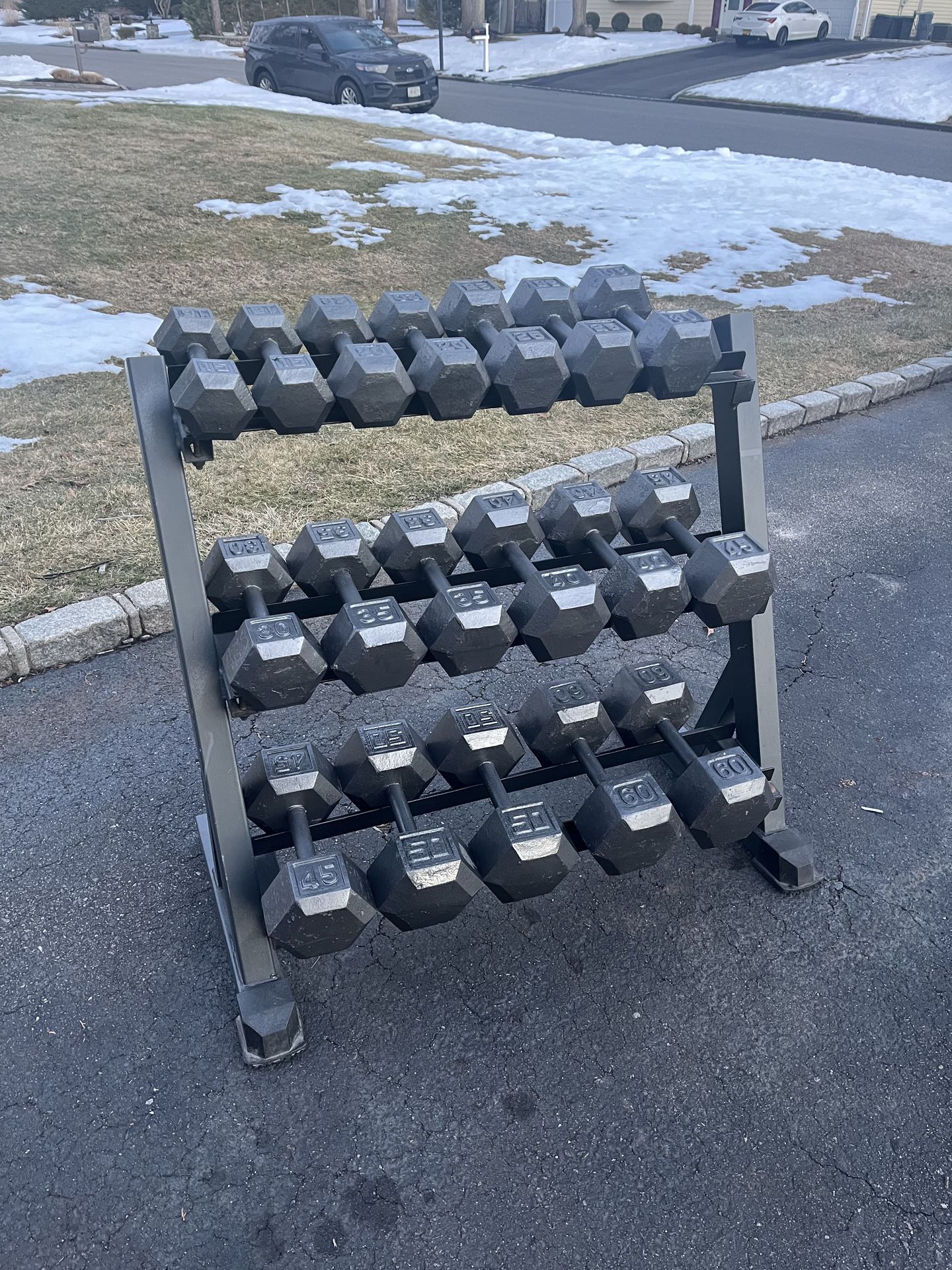 Looking to level up your home gym? This is a complete, pro-grade set of hex dumbbells that are ready for work! These have been meticulously reconditioned and are rust-proof, meaning they’ll stay looking sharp and performing perfectly even in a garage or basement setting. 🛡️✨ No more searching for matching weights—this set comes with a heavy-duty three-tier rack to keep your space organized and safe. 🏠💪 What’s Included? 📋 This set features a solid progression of pairs: • 5 lb Pairs • 10 lb Pairs • 15 lb Pairs • 20 lb Pairs • 25 lb Pairs • 30 lb Pairs • 35 lb Pairs • 40 lb Pairs • 45 lb Pairs • 50 lb Pairs • 60 lb Pairs • Heavy-Duty 3-Tier Storage Rack 🪜 The Details 💰 • Total Weight: 670 lbs • Price: $1.10 per pound • Total Price: $737 💵 These weights are solid, clean, and built to last a lifetime. First come, first served! 🏃💨