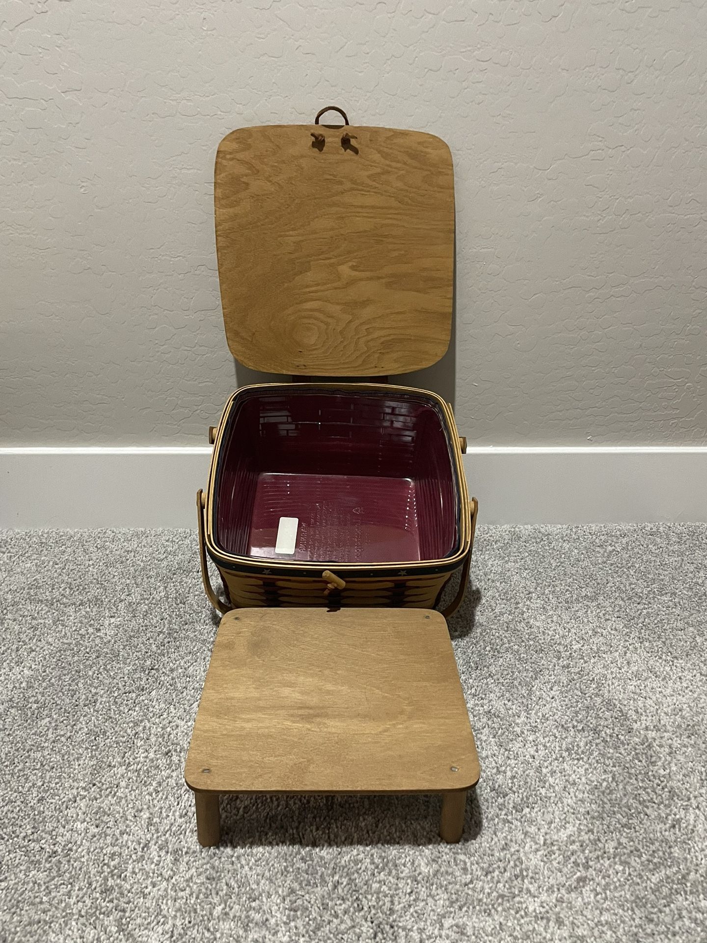 12 x12 inch longaberger pie basket. Includes stand, plastic liner insert, fabric liner, and basket.
