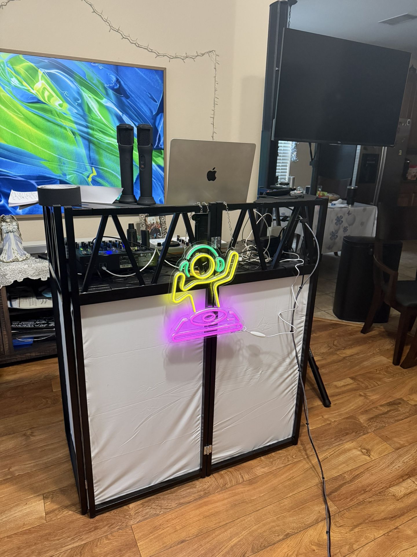 Bought this last year, used about 5x and then upgraded to a different style. Still in excellent condition and includes a travel bag with white and black scrims. Asking $140. Price is for DJ booth table only (neon light not included). Serious inquiries only