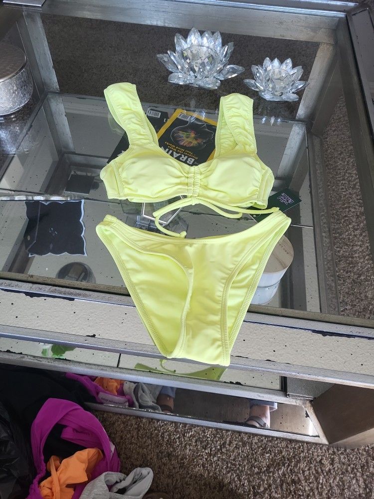 This is a beautiful neon yellow the top is a xs 0-2 and the bottom is xxs