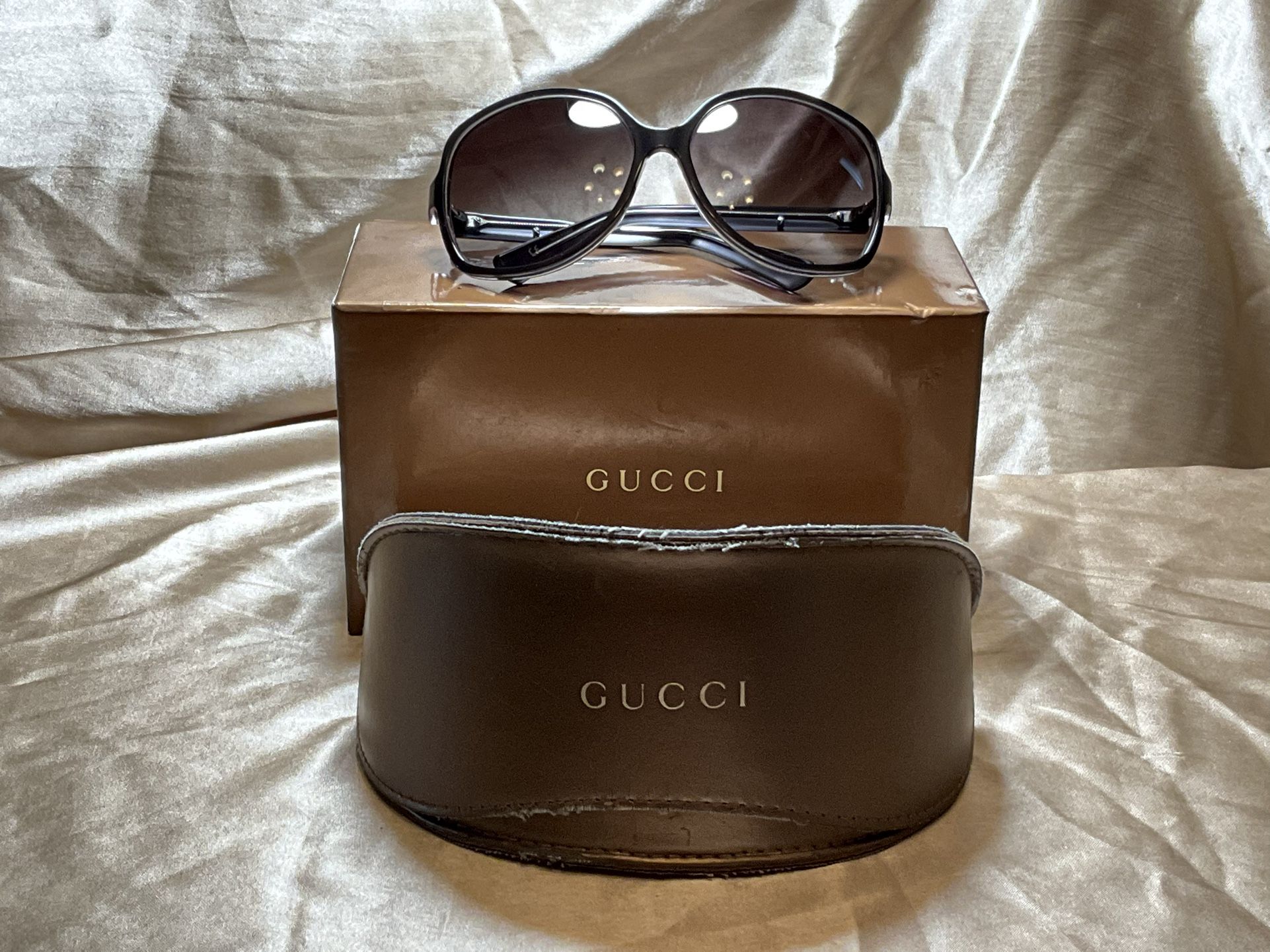 Authentic GUCCI sunglasses with tinted lenses. Case and box included. Elevate your style with these authentic Gucci Sunglasses. The oversized black frames are perfect for women who want to make a bold statement. The gradient lenses provide both fashion and function, while the designer theme adds a touch of luxury. Comes with original case and box for easy storage and transportation. Brand: Gucci Frame Color: Black Lens: Gradient Accent: Logo Condition: Preowned, worn a few times, no noticeable flaws, very few, and minor if any. Please view all photos carefully, to gauge item condition for yourself, before purchasing.