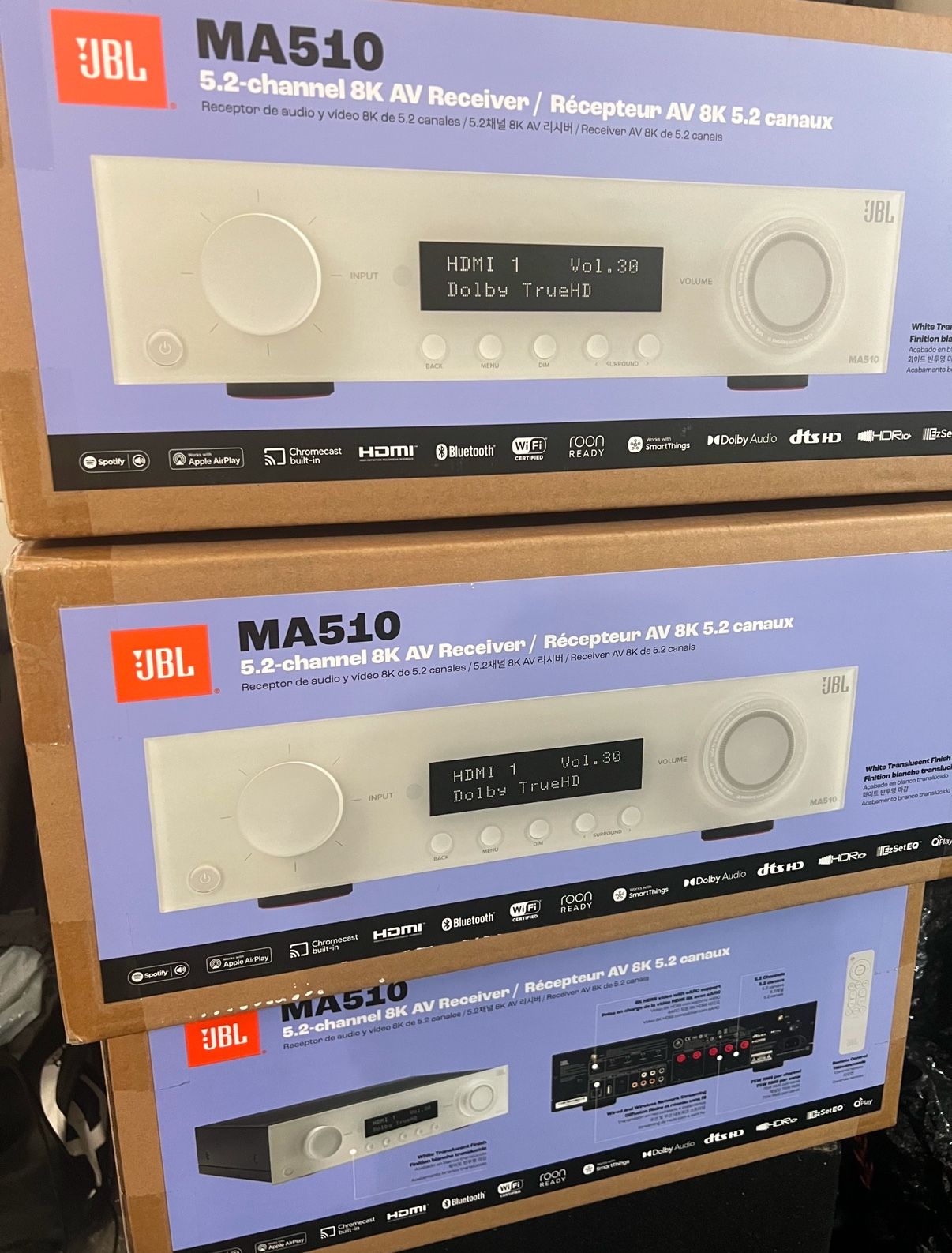 BRAND NEW - JBL - MA510: MA510 75W 5.2ch Bluetooth and WiFi Capable HDR 8K Ultra HD Compatible AV Receiver - White The JBL MA510 is an AV Receiver that delivers spectacular realism with 8K HDMI specifications for a supreme home cinema experience. Seamlessly integrate your smart TV or projector with 4 HDMI inputs and 1 output, plus eARC. With native 5-channel decoding of Dolby and DTS formats, the MA510 can deliver incredible cinema experiences. It is designed with a passion for music and movies, bringing both to life with true high fidelity. Additional music content can be accessed via Bluetooth and network streaming. The MA510 features five channels of low noise Class D amplification for real world power to all channels.