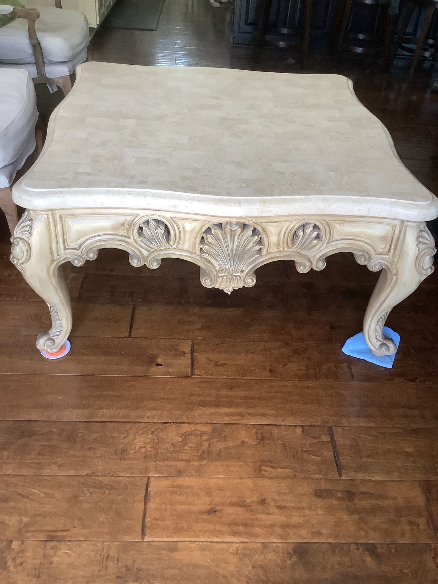 Elegant square coffee table, measures 44” x 44” and 22” high. White washed ornately carved wood and cream color marble top. In excellent condition, no scratches or chips.