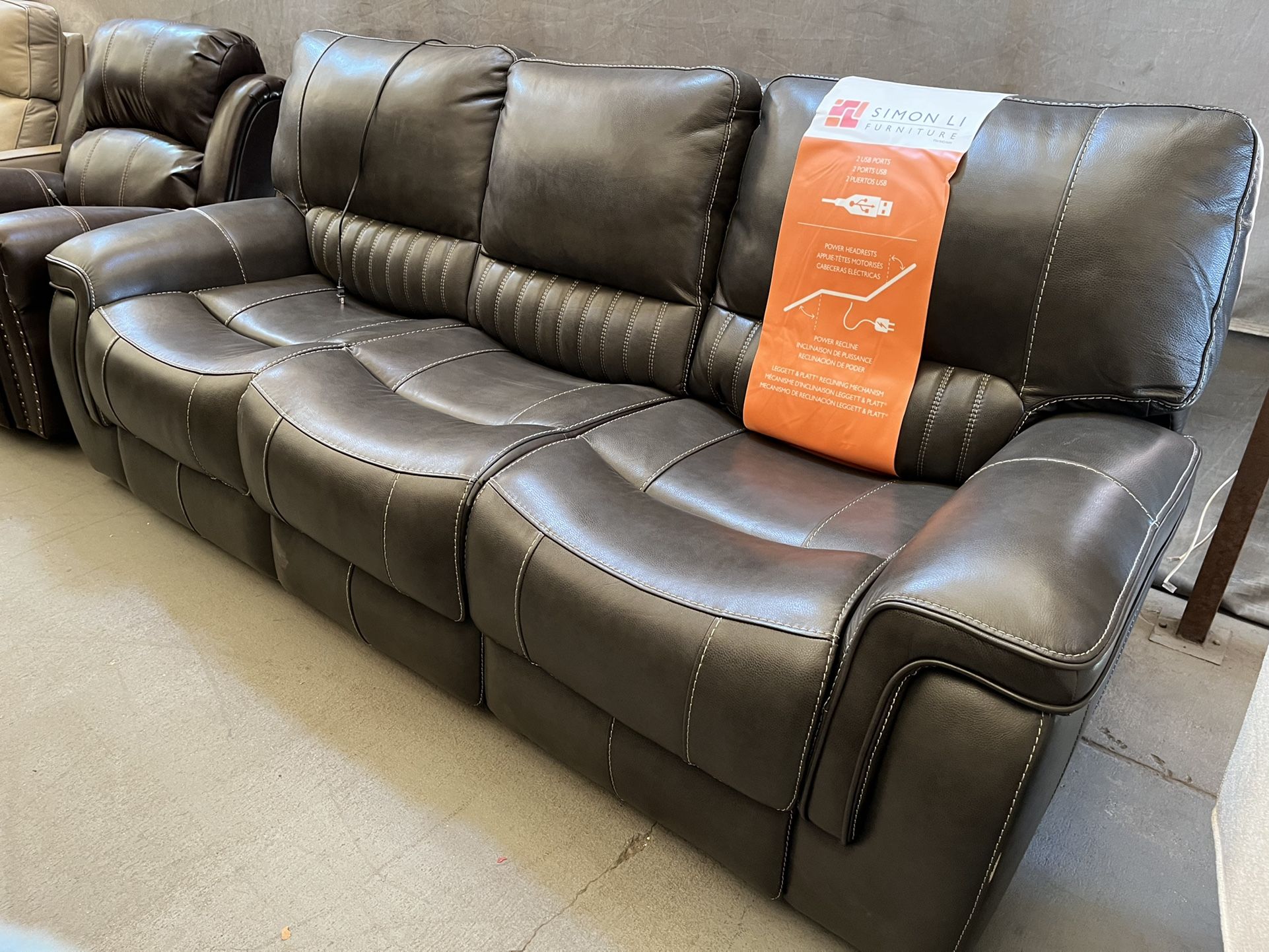 Dark grey top grain leather Adjustable headrest and USB port 90in length 40in h From Costco