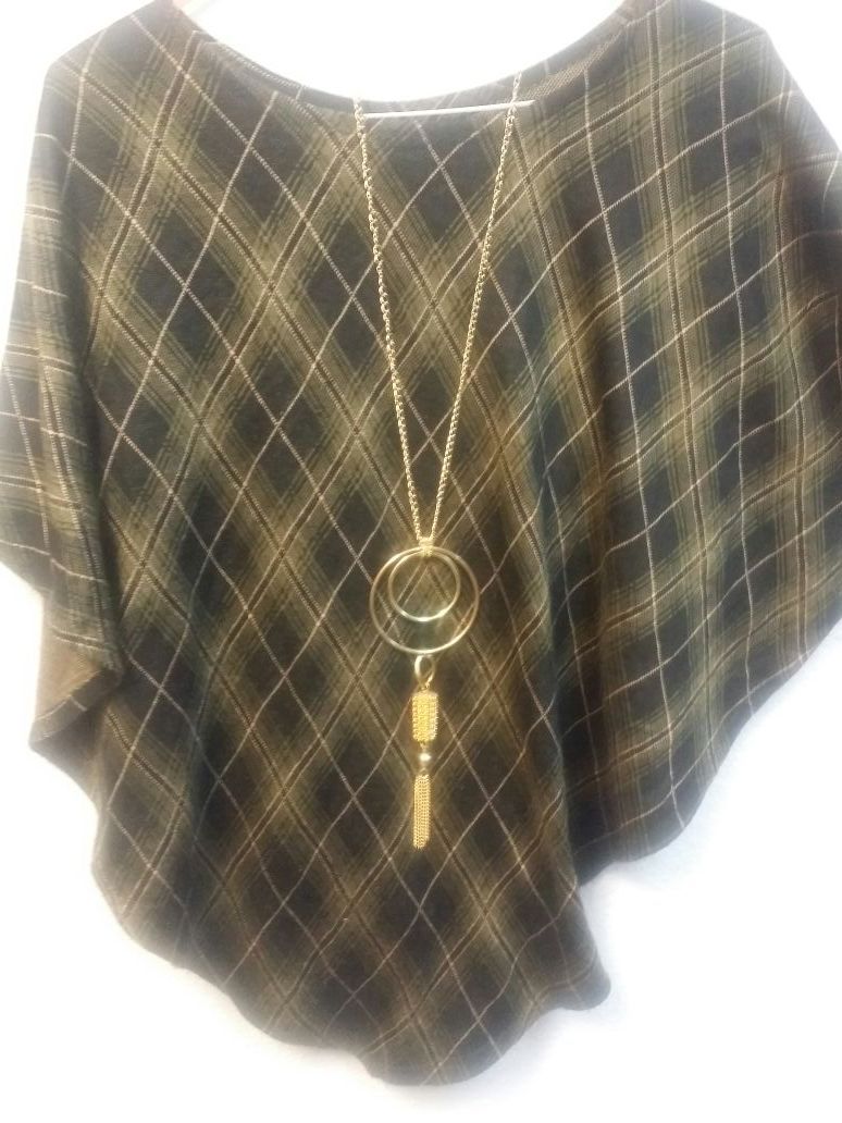 Plaid poncho with gold tassel necklace set