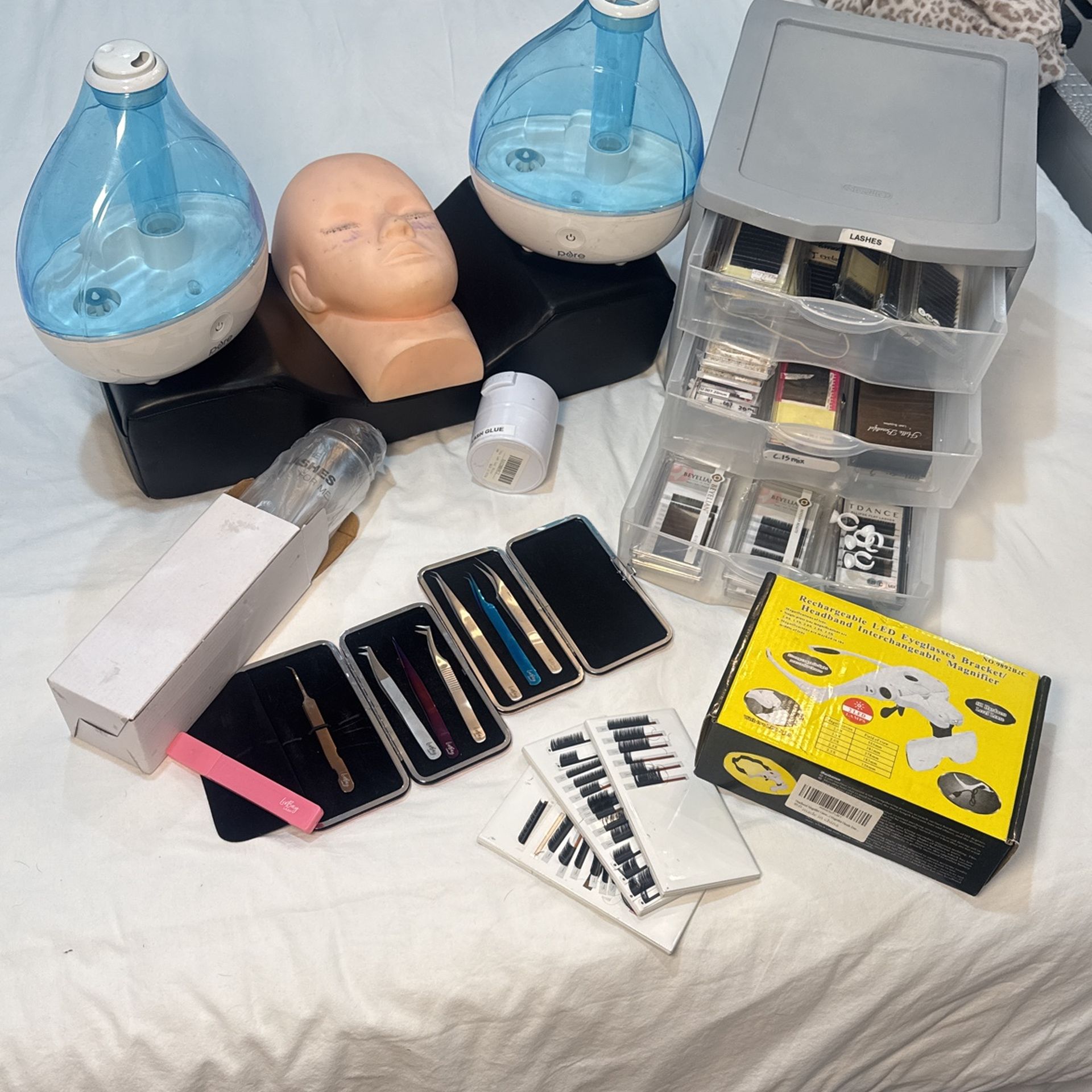 Almost everything you need to start practicing and even doing your own clients! - Air humidifiers SOLD - Lash pillow is black and in good condition. - Organizer is stocked with tons of lashes ranging from different sizes, curls, and diameter. - There are a few glue rings in there as well. - There are also practice lashes to put on the doll head and practice. - Magnifying glasses are like new. - the white tiles are used to lay lashes the current ones are taken off and the desired ones are placed onto it for ease of work. -There are about 30 lash extension trays. 9 are brand new and others are almost new and some are used in different proportions. (Value of atleast $100) *Lash shampoo bottles, about a dozen (not shown yet will post picture asap) to sell to individual clients, very profitable! Everything sold together or something could be arranged. Pick up only.