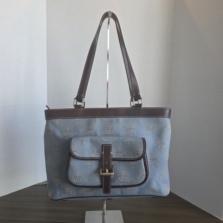 Dooney & Bourke East West Canvas / Leather Trim Donegal Crest Shoulder Tote. Pre-owned condition, please review all pictures for more details and measurements. This tote bag features a spacious rectangular design with a zip closure and double brown leather handles/straps. The exterior is made of canvas (often tan and blue or tan and green) with the iconic Donegal Crest monogram pattern and contrasting leather trim. Features: It includes inner pockets for organization, a key clip, and an exterior pocket with a buckle closure (as seen in the image). Dimensions: While specific dimensions may vary slightly by listing, a similar model is described as approximately 15" W x 10" H x 4.5" D, with an 11" handle/strap drop.