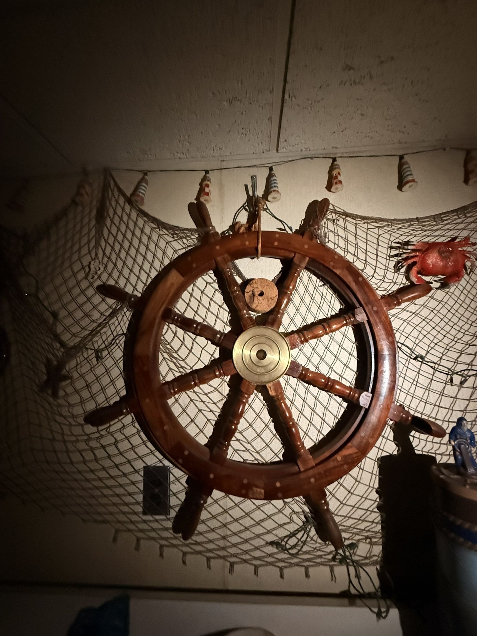 Large nautical ship wheel made of solid wood with a real brass center hub. Beautiful craftsmanship with rich wood tones and classic maritime style. This is a substantial, eye-catching piece — not a small wall prop. Perfect for coastal homes, beach houses, restaurants, bars, Airbnbs, or nautical-themed décor. Can be wall-mounted or used as a floor display. Details: • Solid wood construction • Brass center hub • Large statement size • Decorative rope accent • Excellent condition Very sturdy and well cared for. No major damage. Local pickup preferred due to size and weight. Keywords (optional): nautical decor, ship wheel, maritime decor, coastal decor, beach house decor