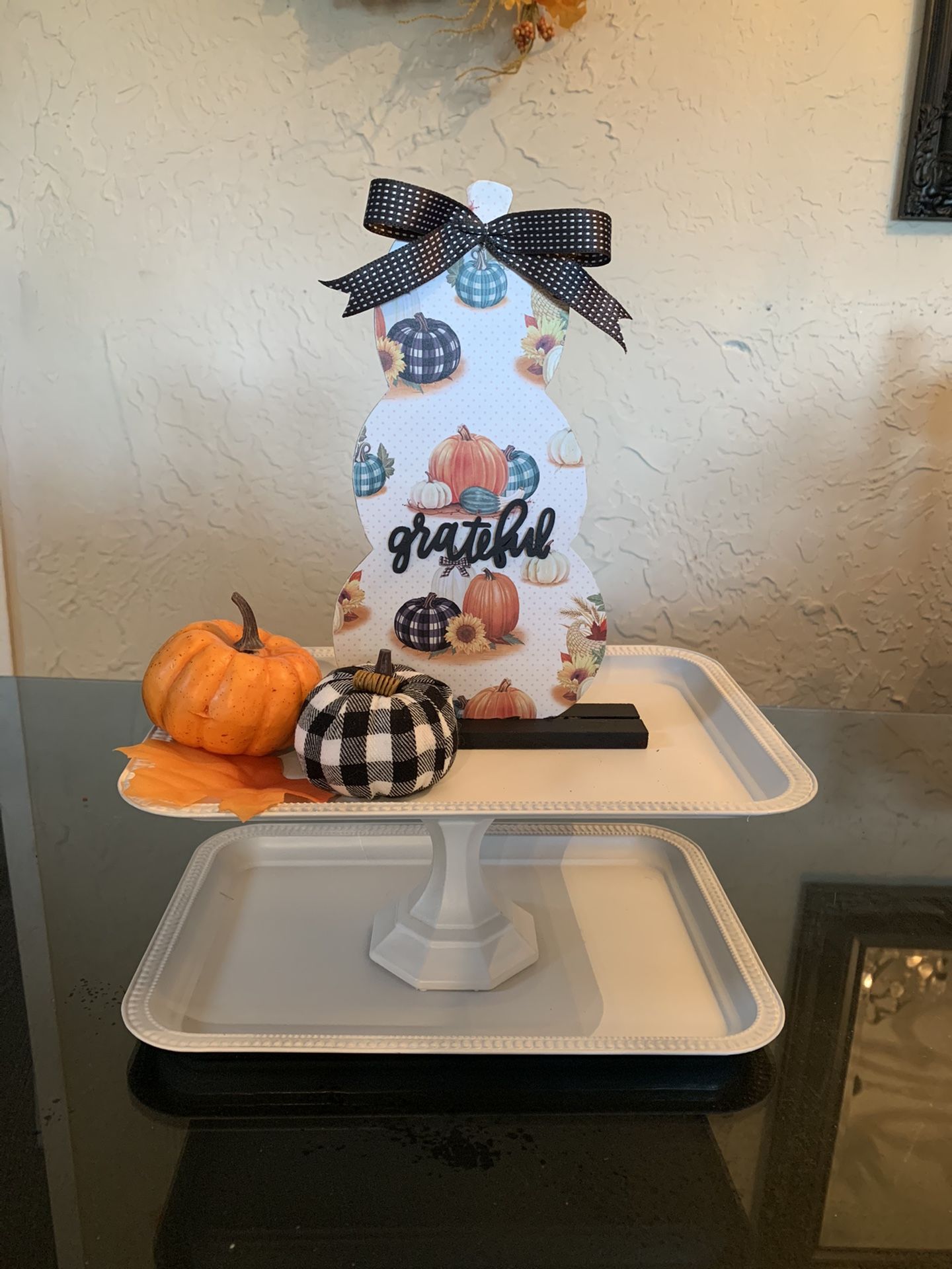 Fall wooden topiary sign and 2 pumpkins only. Tier tray is for display only $8. Tray is sold separately upon order. Pick up only