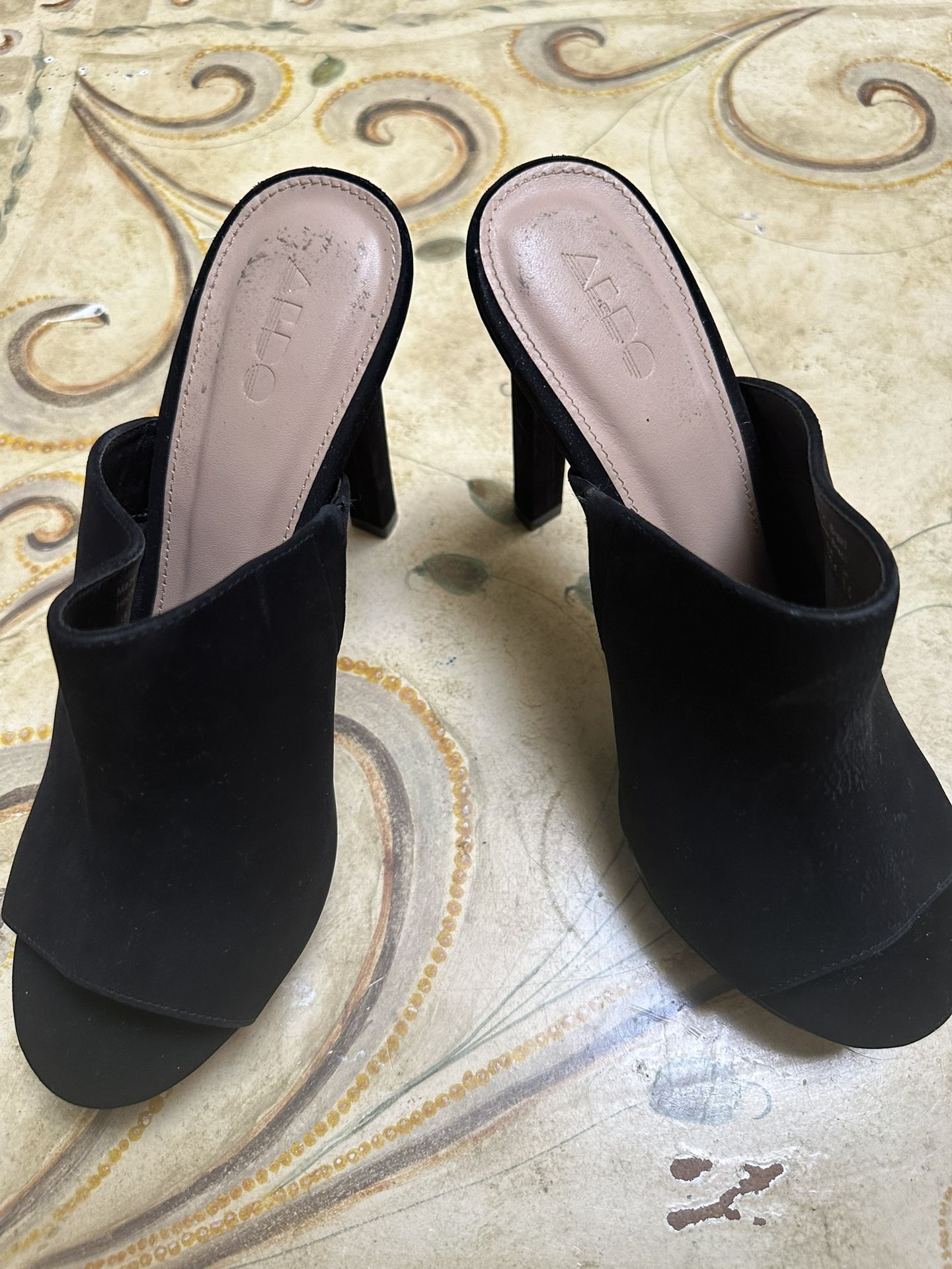 Step into style with these sleek Aldo black suede mule heels. Designed with a peep-toe front, tall 5” heel, and subtle platform, they’re the perfect mix of chic and bold. Great for a night out, special occasions, or adding instant height to any outfit. • Brand: Aldo • Size: 8 • Color: Black • Material: Suede upper, leather insole • Heel Height: 5 inches • Condition: Pre-loved, gently worn with minor insole wear (see photos) Originally $99