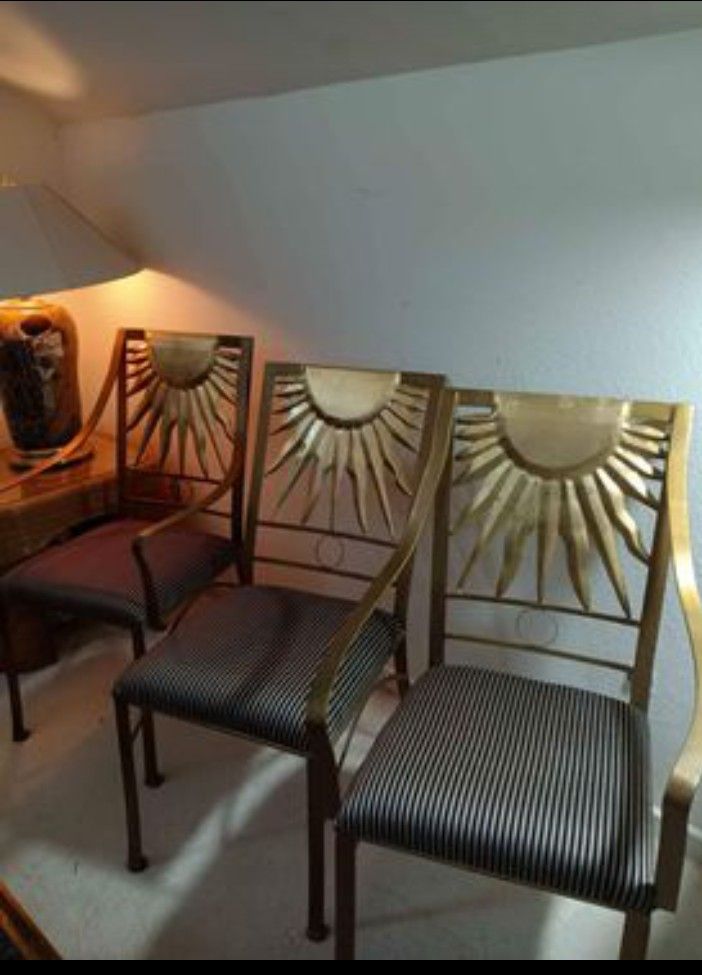 Sunburst Glazed Iron Gold Leaf Chairs. Black & Gold Stripe Covers. Set of 3. 2 with Arms. 1 no Arms