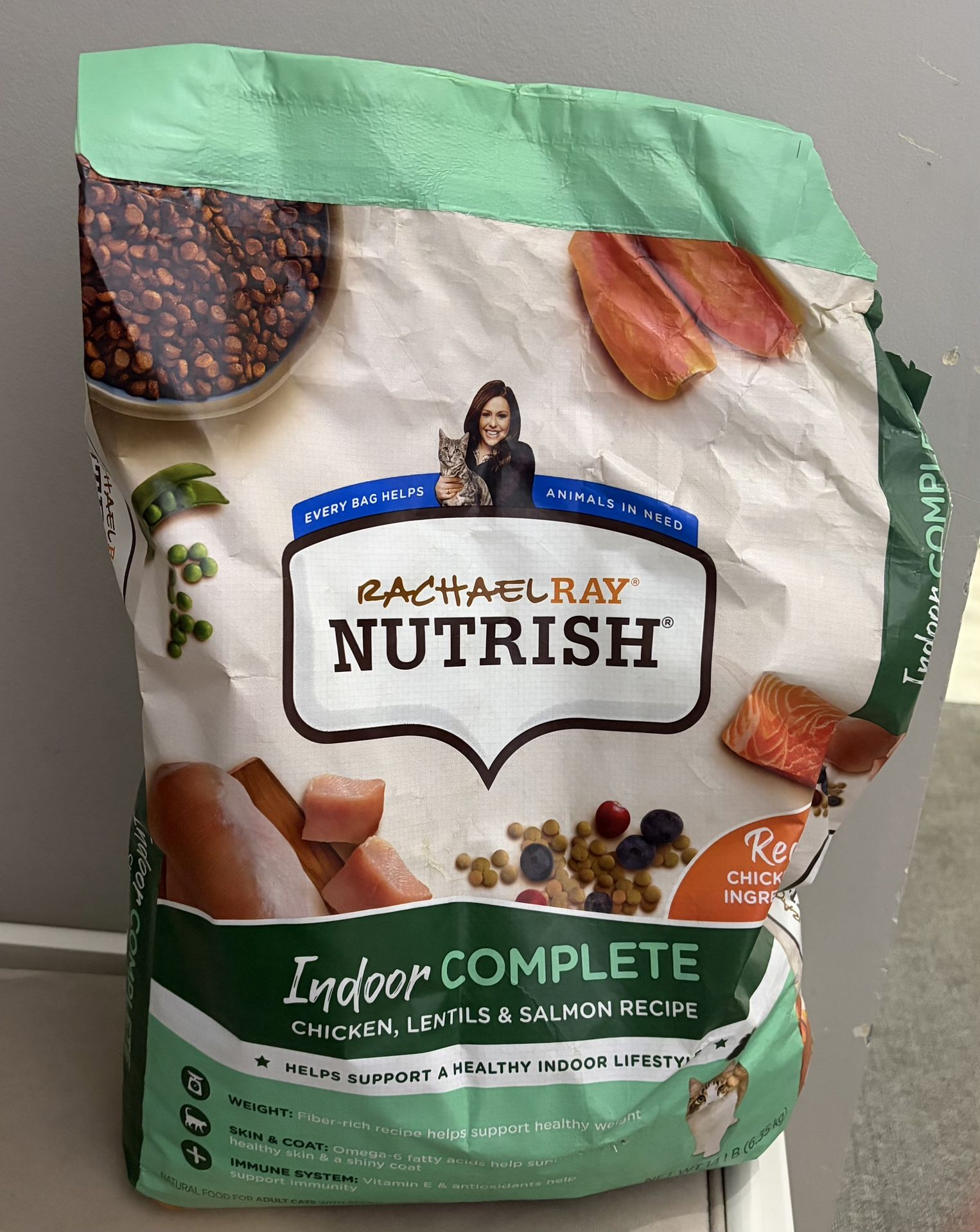 Rachel ray nutrish indoor cat food. Chicken, lentil and salmon. Good for all stage. My cats changed diet due to some health issues. The bag is more than half full. Expiration date is March 2026. Pick up only.