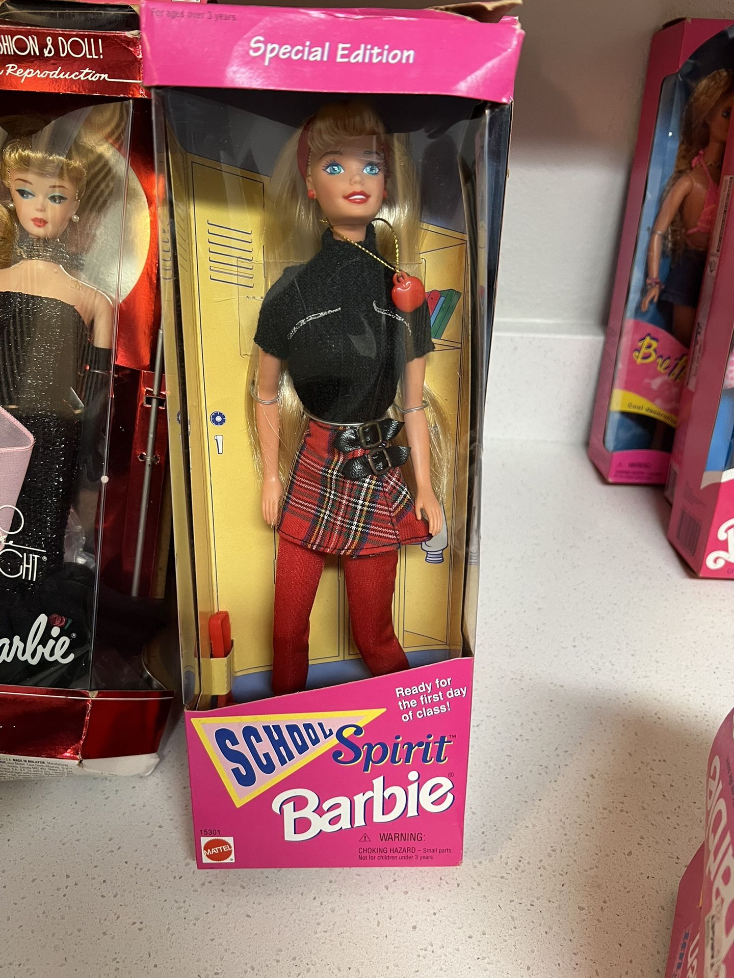 1995 Special Edition School Spirit Barbie Doll by Mattel. The doll has blonde hair, blue eyes, and is ready for the first day of class. It comes dres