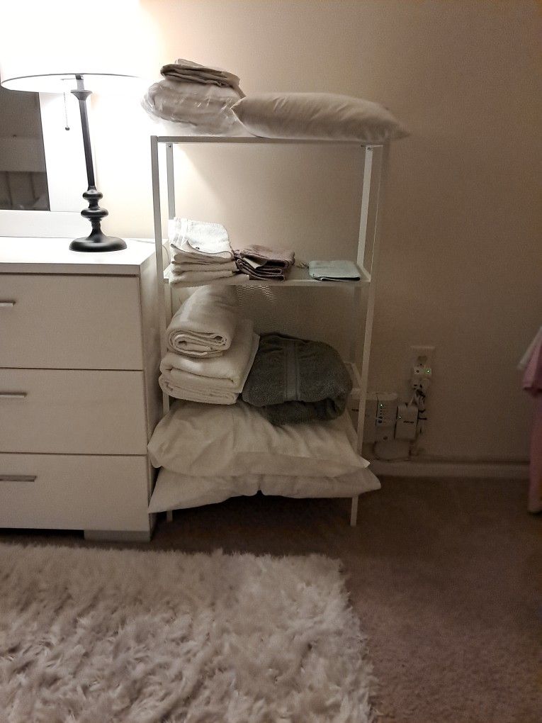 Stylish metal storage rack for linens and home textiles. Metal display shelf. Linen storage rack. Almost new, used 6 months. Practical inside or outside the closet. Sleek metal, industrial style. See photos for measurements.