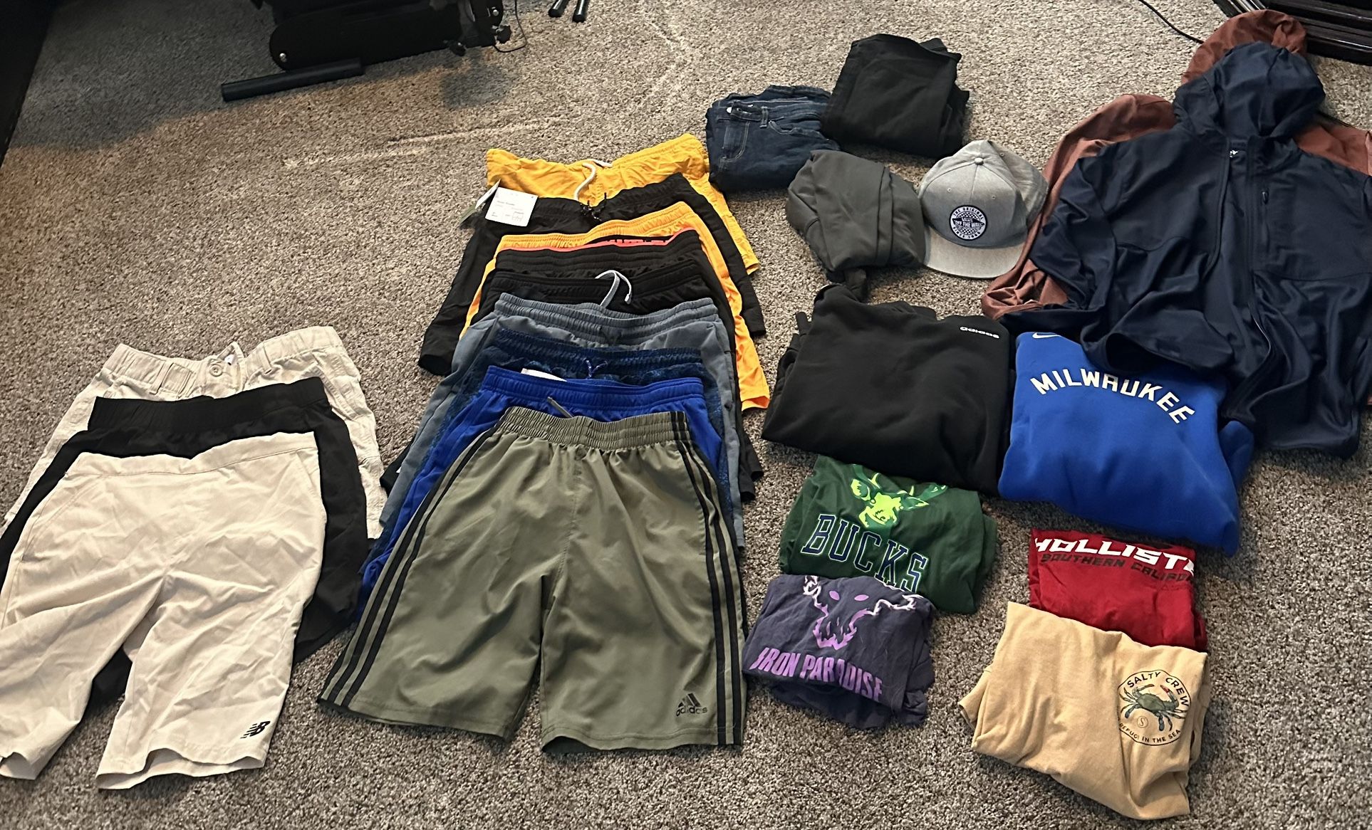 3 pairs nice shorts. 9 pairs athletic shorts 3 t shirts 1 long sleeved shirt 2 hoodies 2 old navy jackets 2 pairs jeans (size 16) 1 pair puma athletic pants 1 vans hat