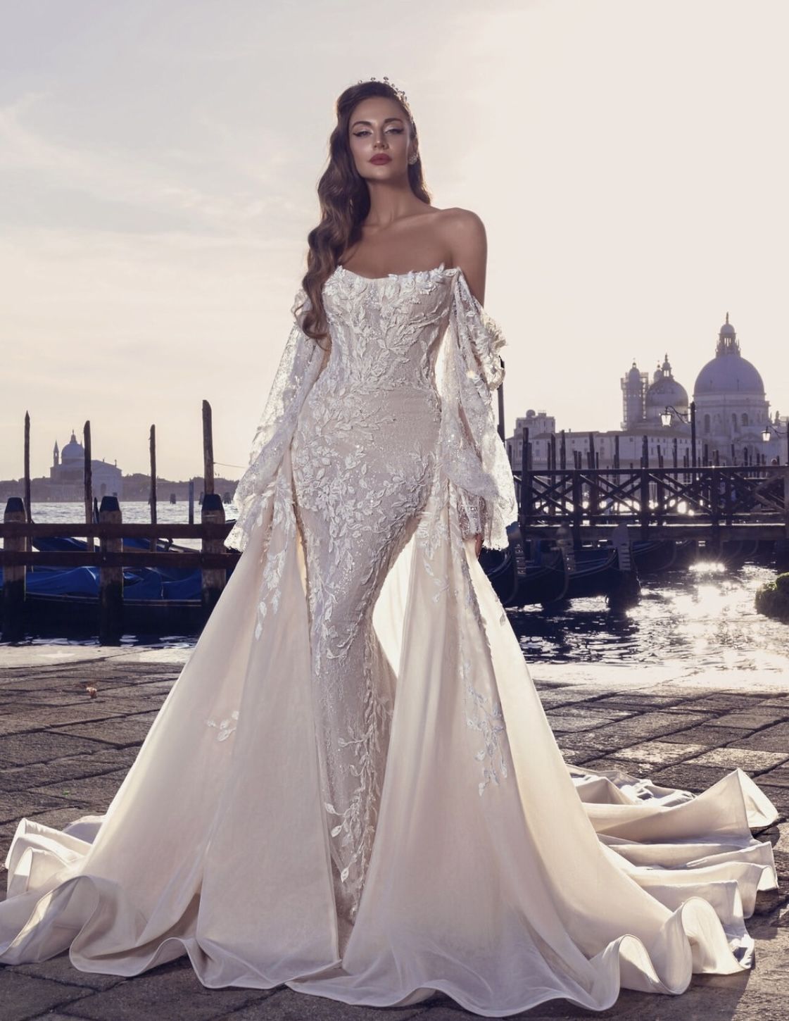 Wedding Dress For Sale Brand: Mistrelli Style #: Nymeria Color: Ivory Size : 2 (It is wider around the hips, I can send me exact measurements in direct message) Asking price: $1000 OBO -Dress is professionally steamed and preserved in box as shown in last photo. -Dress comes with two different styles of detachable sleeves, one is long sleeve and the other style is off the shoulder. -Dress comes with detachable overskirt -Professional Alterations to the dress include: -extra underlining to make dress appear more white -custom made two different styles of detachable sleeves -changed the corset tie back to a zipper instead but zipper does not show. The dress without the overskirt is also very beautiful and has a long train which can be bustled. Serious inquiries only. Located in Niles, IL — happy to share more pics or details.