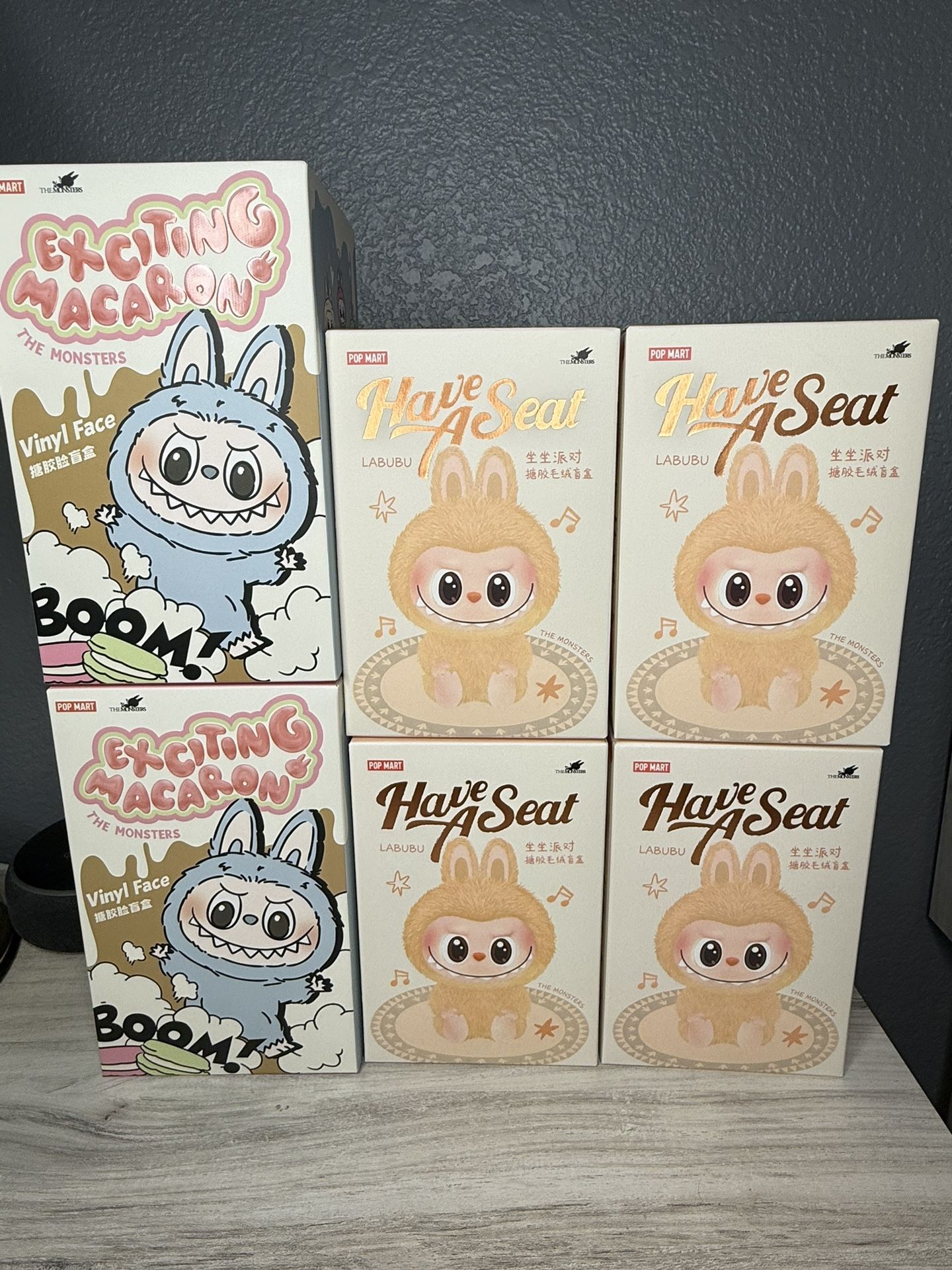 Authentic labubu’s Available (BOX CLOSED) 5-Have a seat: $45 each 2 Exciting macaron: $45 each I will send proof of receipt !SERIOUS BUYERS ONLY! Labubu’s Auténticos Disponible 5-Have a seat:$45 cada uno 2-Exciting macaron: $45 cada uno Mando recibo pago oficial All authentic labubu
