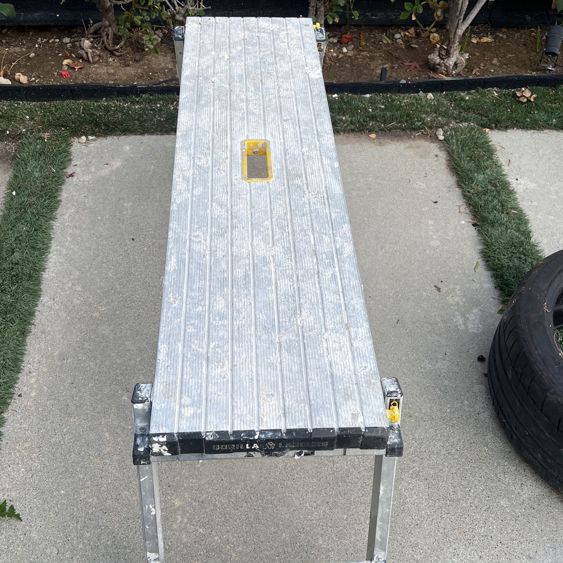 Used Gorilla Ladders aluminum work platform in solid condition. Great for painting, drywall, repairs, and general jobsite use. Sturdy and stable, with adjustable legs and a comfortable top handle. Shows normal wear from jobsite work including paint spots and surface marks, but functions perfectly. Aluminum construction makes it lightweight yet durable.