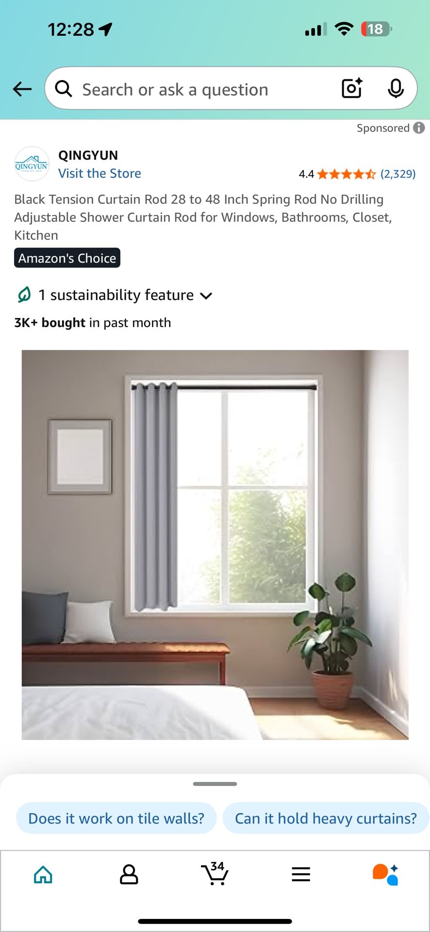 New Black Tension Curtain Rod 28 to 48 Inch Spring Rod No Drilling Adjustable Shower Curtain Rod for Windows, Bathrooms, Closet, Kitchen