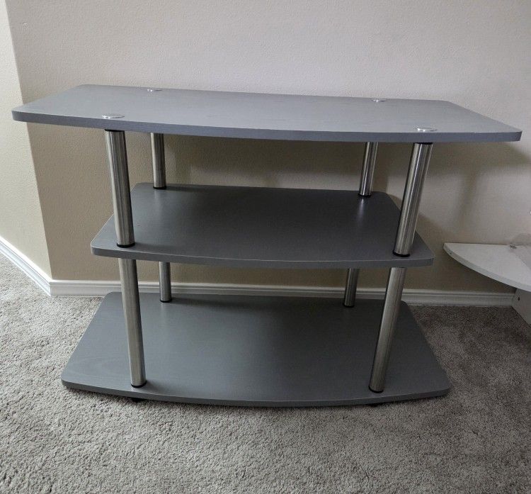 TV/Media/Component table, 3 tier. Gray wood with aluminum supports. Measurements are 31 1/2" wide, 15 3/4" deep, 22" high Check out my other offers!