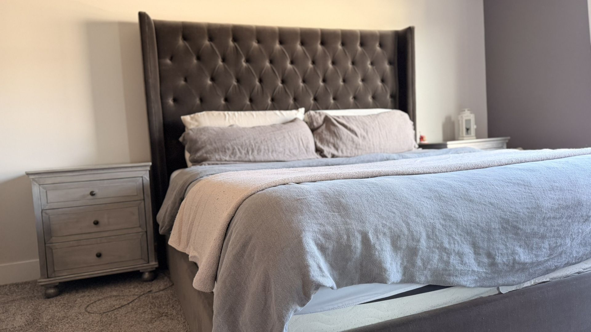 What’s included: King Bed Frame Tall Tufted Headboard 83” wide 67” high 3 fabric sides and footer Wood slate frame All bed frame hardware Fabric slightly faded on top left side panel (see picture) MATTRESS NOT INCLUDED BEDDING NOT INCLUDED Night stands (x2) 25.5x18.5x29 tall Light gray 3 drawers Tall Dresser 68x19.5x50 11 drawers Matching style to night stands Darker gray Top has some fading (see pictures) Palazzo Antiqued-Glass Floor Mirror 24x79.5x1 All items are in excellent condition. Solid wood furniture built to last. Similar set purchased today: $15,290 Only available until April 30.