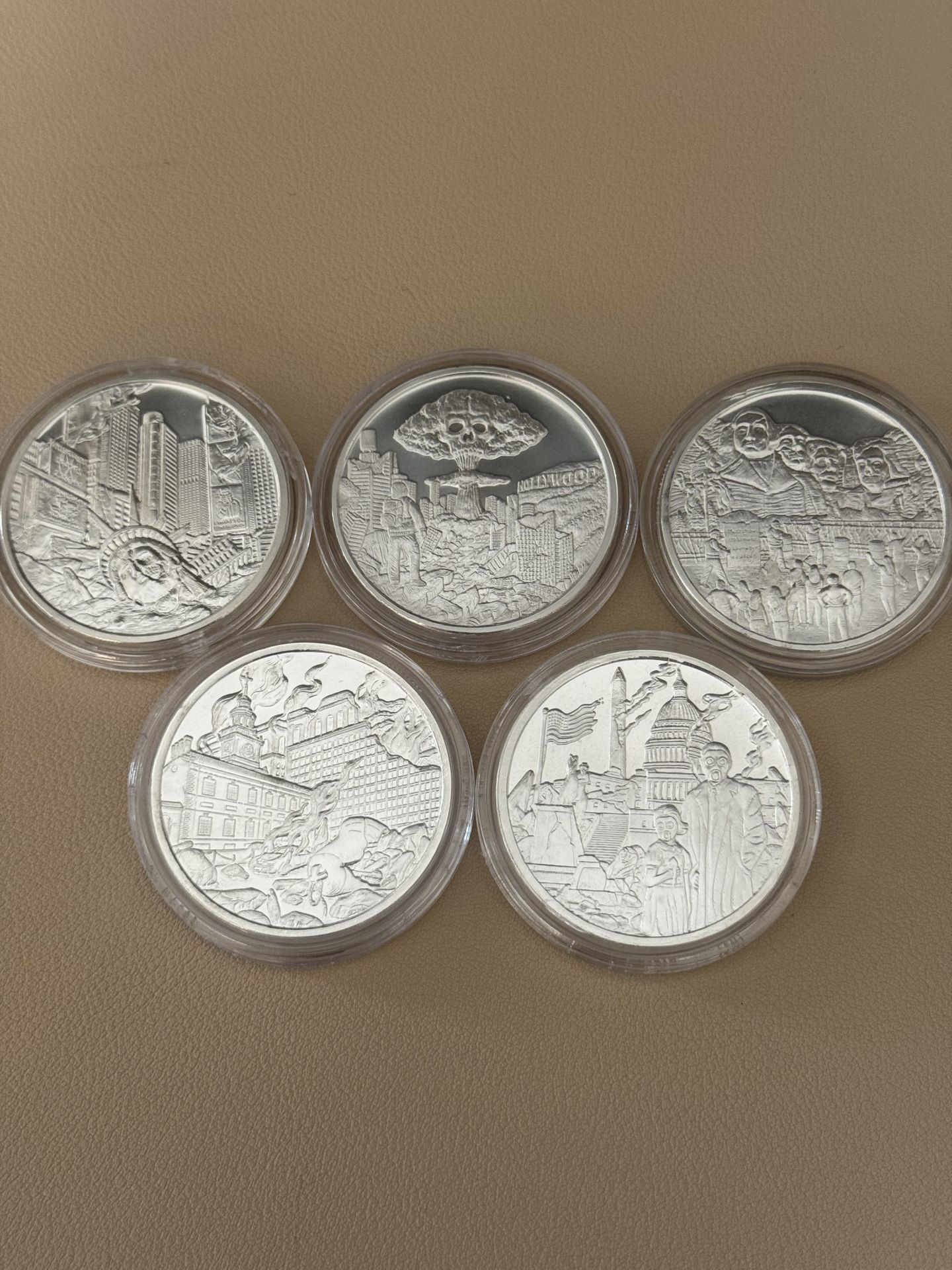KITCO Spot- $69.22 Set of 5 Reckless Metals America The Beautiful Disaster Silver rounds with COA. • Shrine of Democracy • City of Evil • Freedom’s Last Ring • Chamber of Secrets • Death, Chaos & Pursuit of Control Sold as a set. Will not break up. $625 Minted once and never again. Check out the listings on eBay.