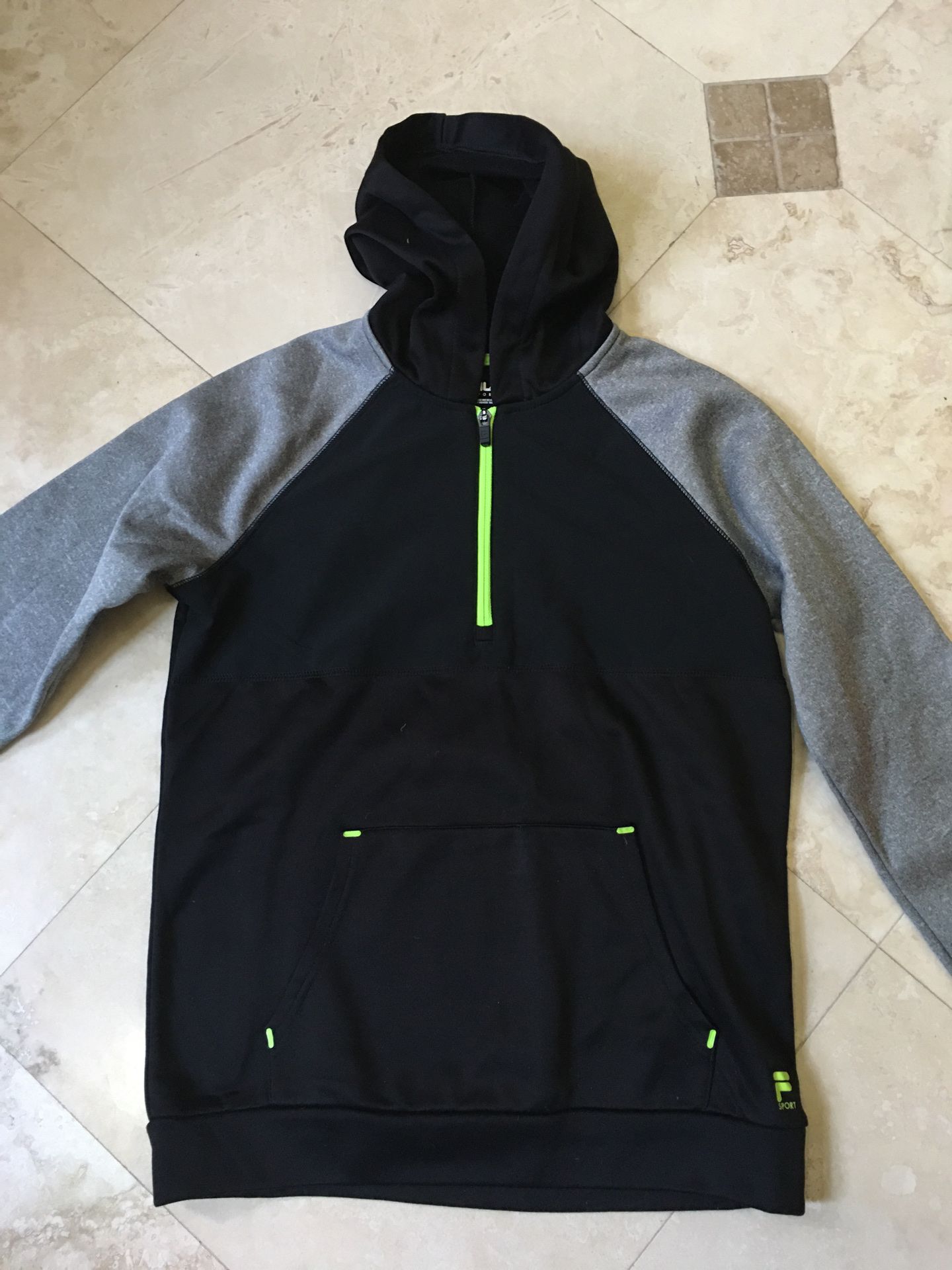 Tag says Fila sport. In very good condition! Machine washable jacket. Partial zip. Kangaroo pocket(s) in front. Fleece like lining Black and gray with neon/bright green accents. Hood is attached. Well cared for jacket .