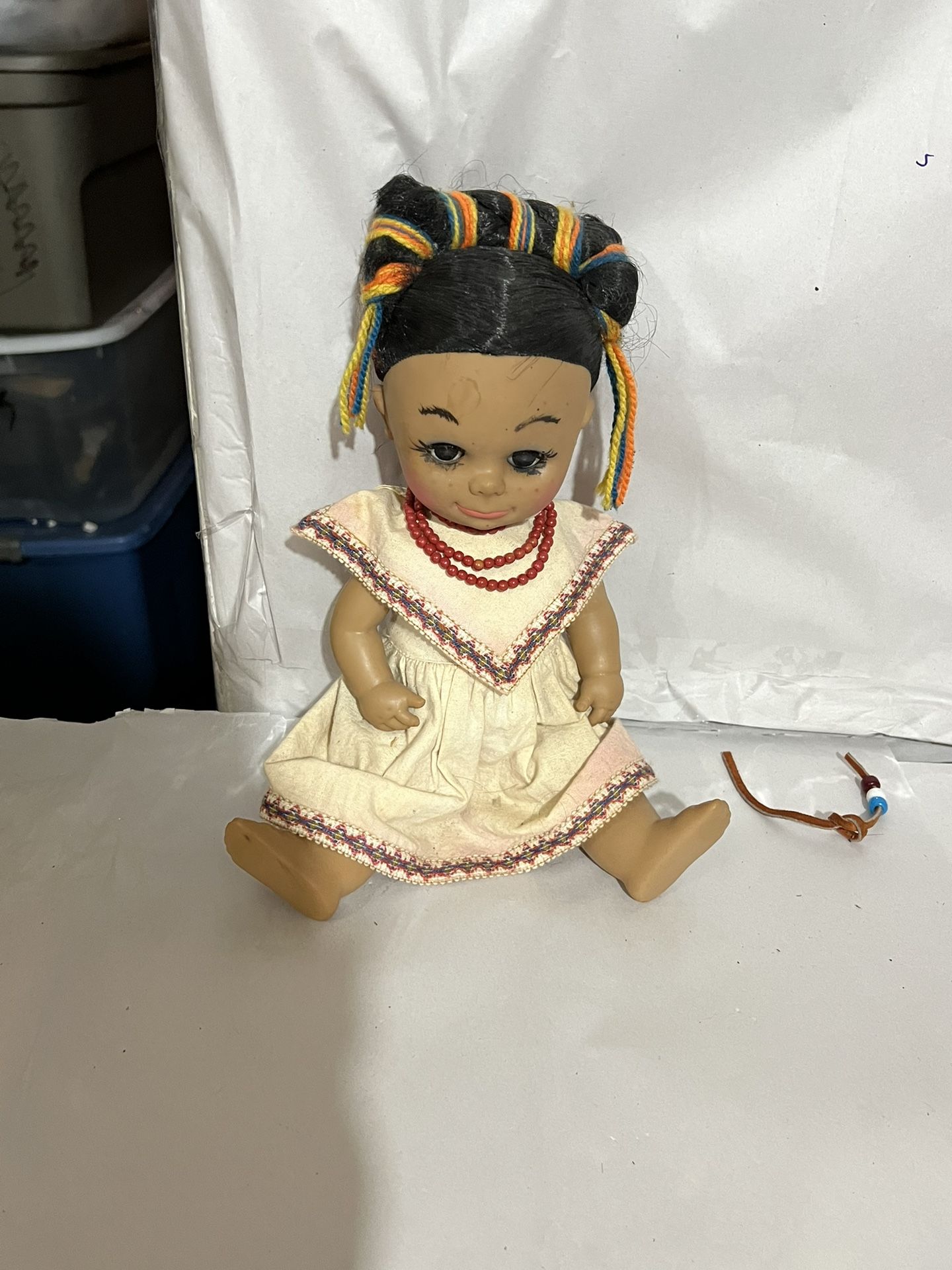 VtgDoll 11”long She Has Yellow Dress Black Eyes Straight Black Hair