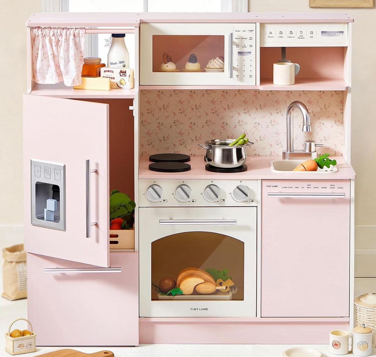 New In Box Tiny Land Play Kitchen for Kids, Upgraded Wooden Kitchen Toy with Complete Play Areas, Pretend Cooking Set with Sink, Stove, Microwave, Toy
