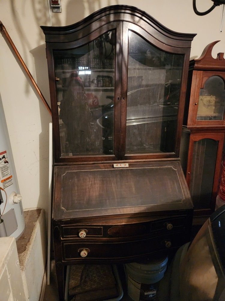 Vintage secretary desk w/ hutch. Both drawers have dividers. The hutch comes with 3 glass shelves (will need some new wooden dowels for one of the shelves. Not sure if the lighting works, but it has a light in the desk part and the display hutch. Knobs have mosaic detailing. It was my grandmother's, so it is possibly antique. I have no idea what the true age of the piece is, but it is quite old. It's approx 75" tall (including the highest curve at the top), approx 19" deep (including the drawer pulls), and 33.5" wide.