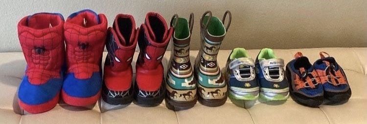 New toddler shoes. Rubber Rain boots, Toy Story shoes which blink on the sides. Spiderman boots are more thick warm, new aqua shoes all are size 6. Spiderman slippers size 7/8. Please message with any questions. $20 obo