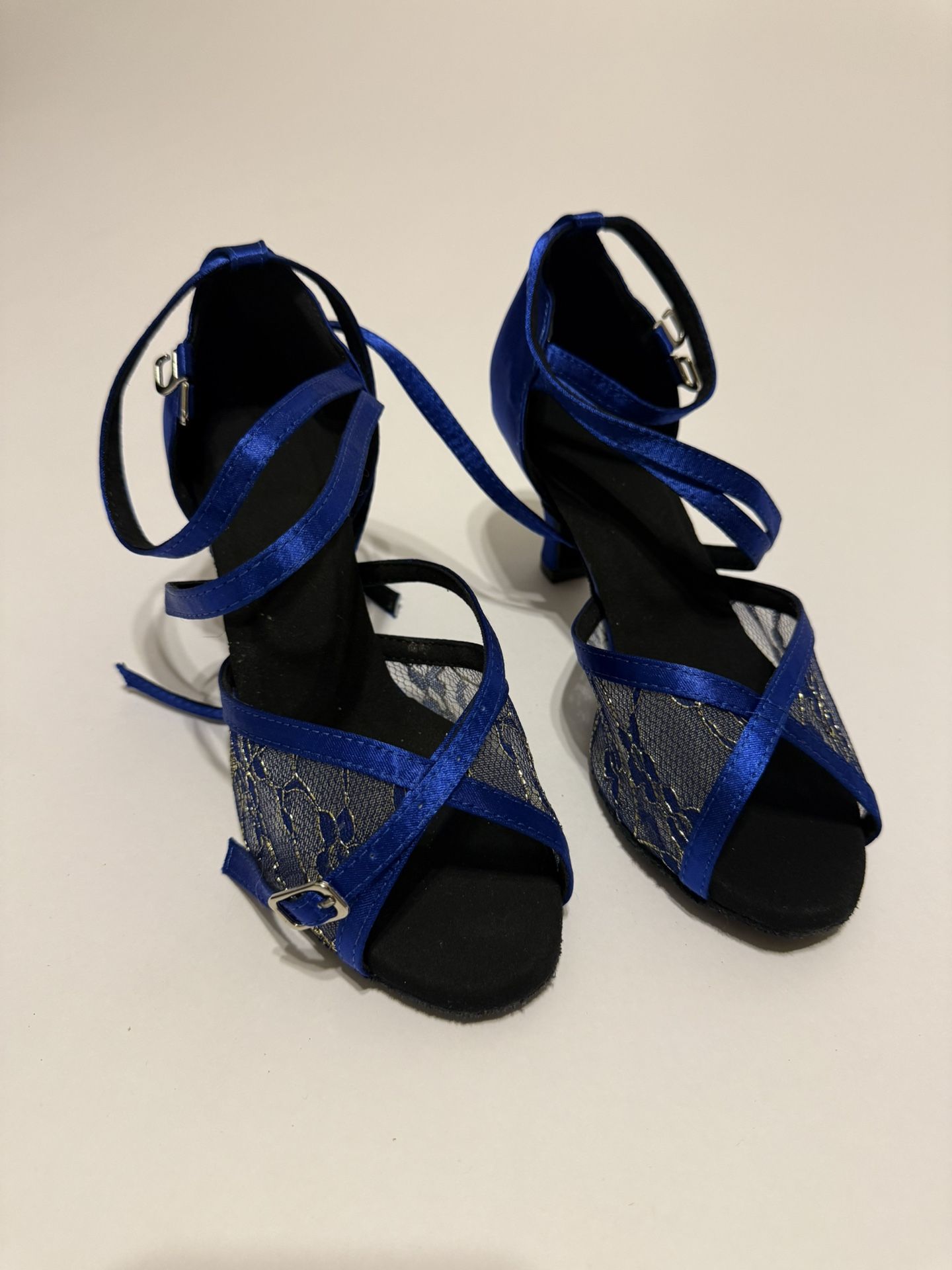 Turn heads on the dance floor in these stunning royal blue Latin dance shoes π β’ Size: US 4.5-5 / EU 34-35 β’ Elegant lace with satin straps β’ Soft suede sole β ideal for salsa, ballroom, rumba or cha-cha β’ Secure ankle strap & comfortable heel height β’ Gently worn / new condition π Perfect for competitions, practice, or special dance nights! π° Price: $45