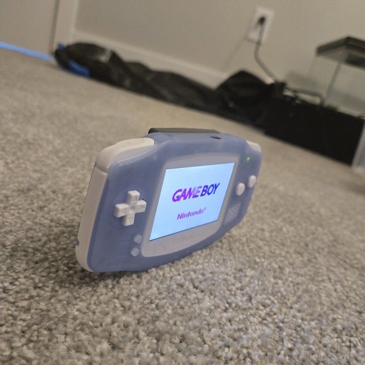 A Gameboy Advance I modded Florescent blue and white Has IPS backlit screen and a rechargeable battery Audio was not changed Good condition no scratches, marks, or cracks Works perfectly DOES NOT COME WITH GAME It does however come with the case