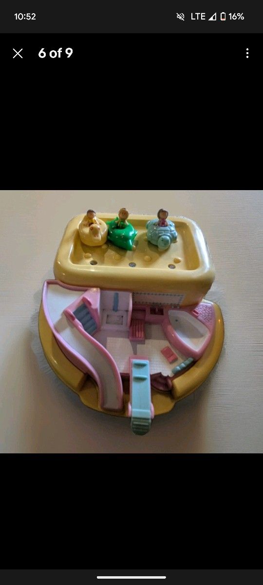 Bluebird Hair Salon Polly Pocket is nearly mint, but missing the hair salon client Polly. Included is a damaged Slumber Party Polly. Sun damage on front, missing both Polly's.