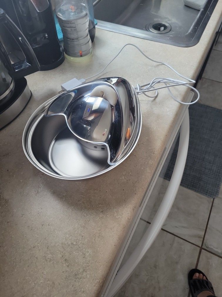 Bought this so my cat would stop splashing the water all over the place. Turns out she'll just flip the whole thing over. Have resigned myself to just let her drink from the tap. Comes with extra filter.