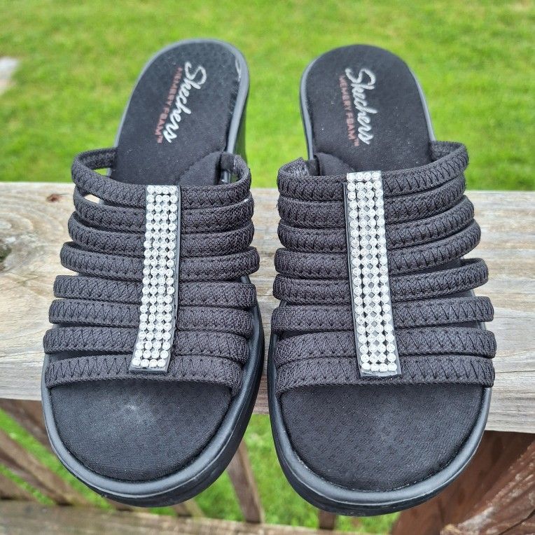 Skechers Womens Size 8 Cali Rumblers Wedge Heel Sandals Strappy Black Memory Foam Heel is approximately 2.5" In good condition from a smoke free home