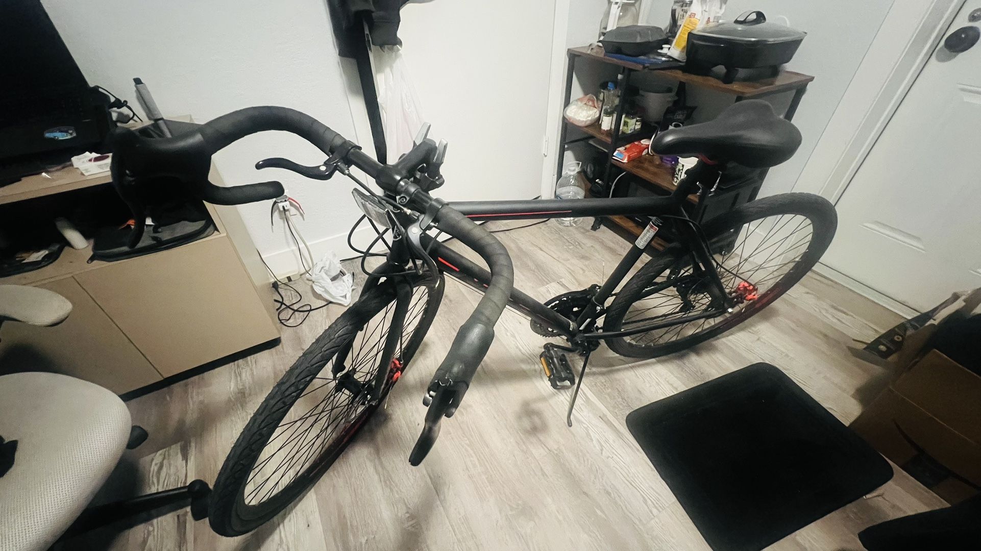 It has only a few miles on it; it’s practically brand new. Dual brake system on the handlebar, disc brakes, Shimano 12-speed gear system.