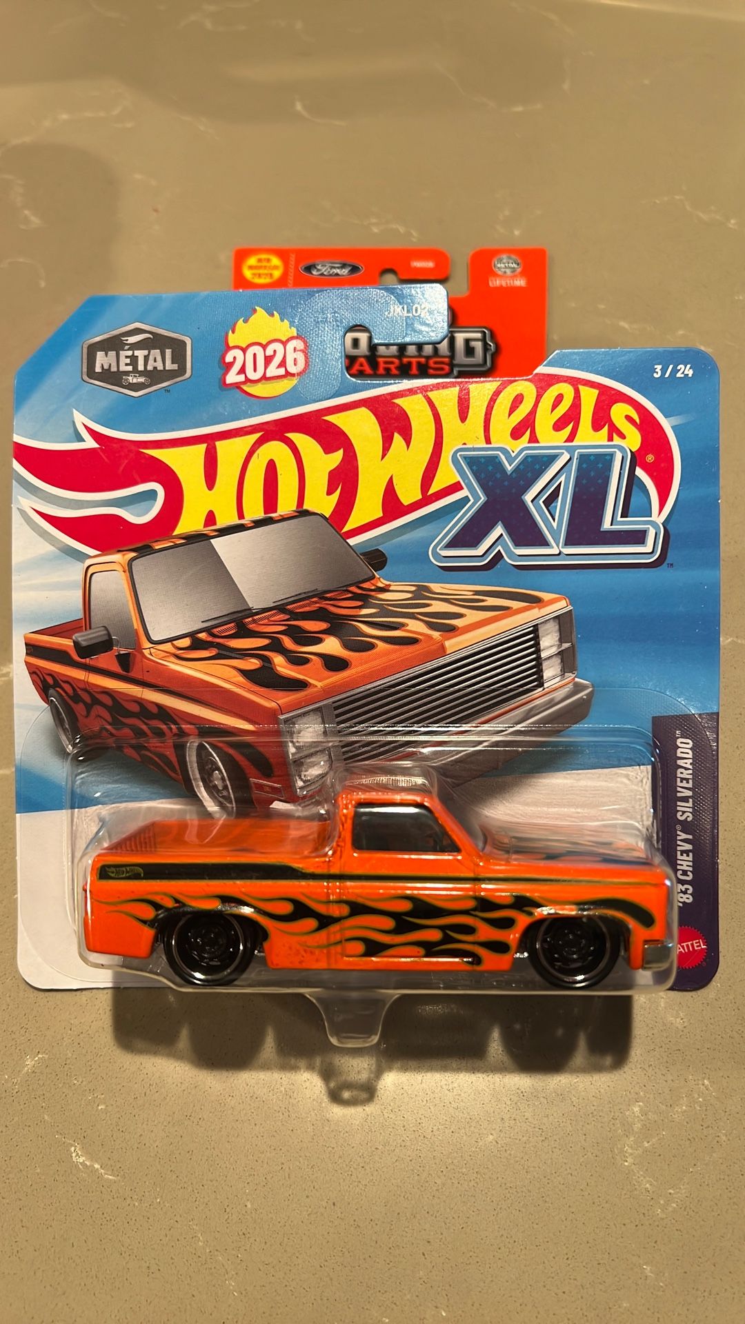 2026 Hot Wheels XL 1:43 1983 Chevy Silverado Orange W/Black Flames - Diecast $20 dlls