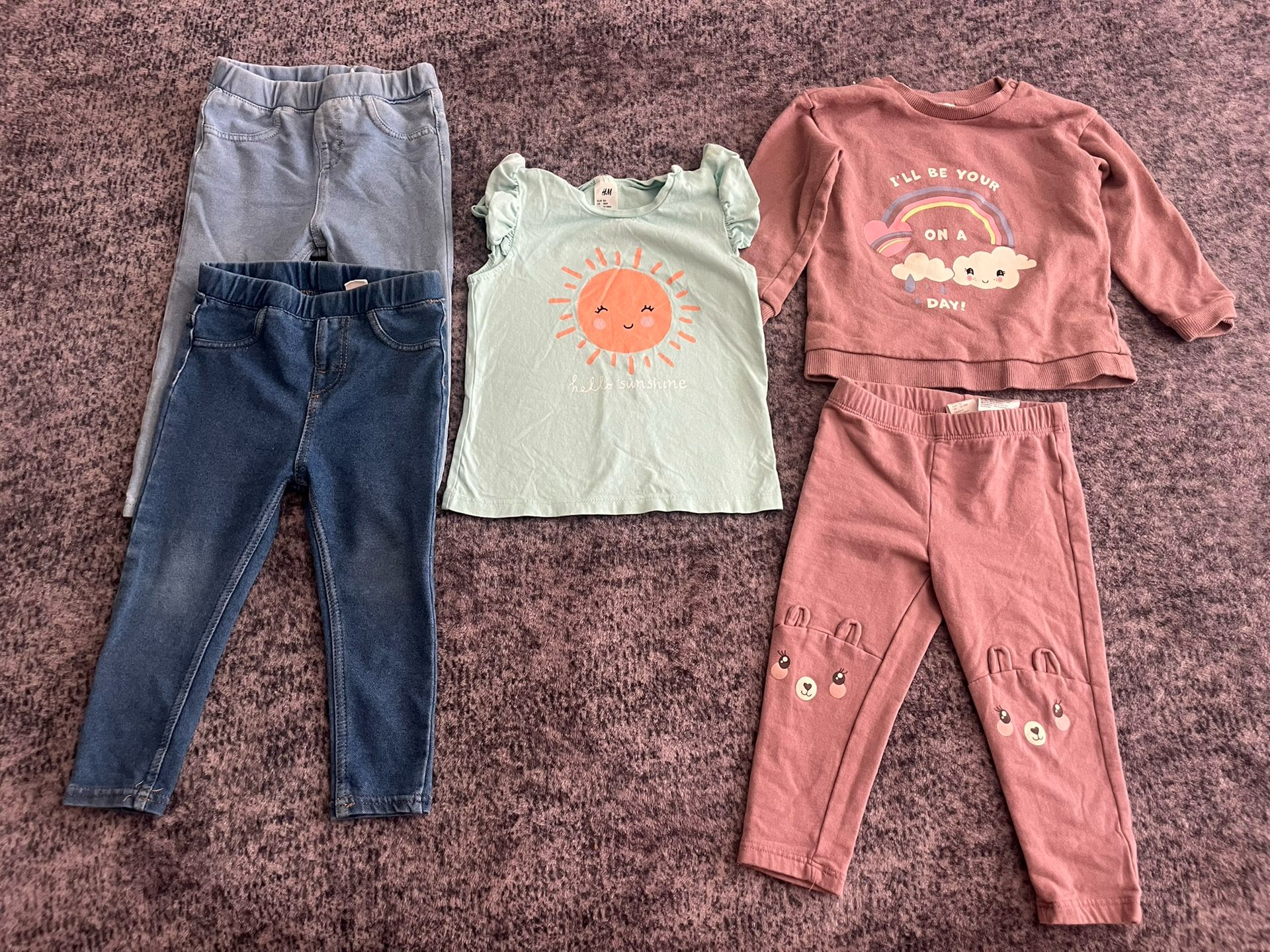 Two pairs of denim light and medium blue jeggings Cute Sunshine Top Sweater with adjustable snap button neckline Pink Leggings with Bear Design on Knees All Size 18M Gently used; great condition.