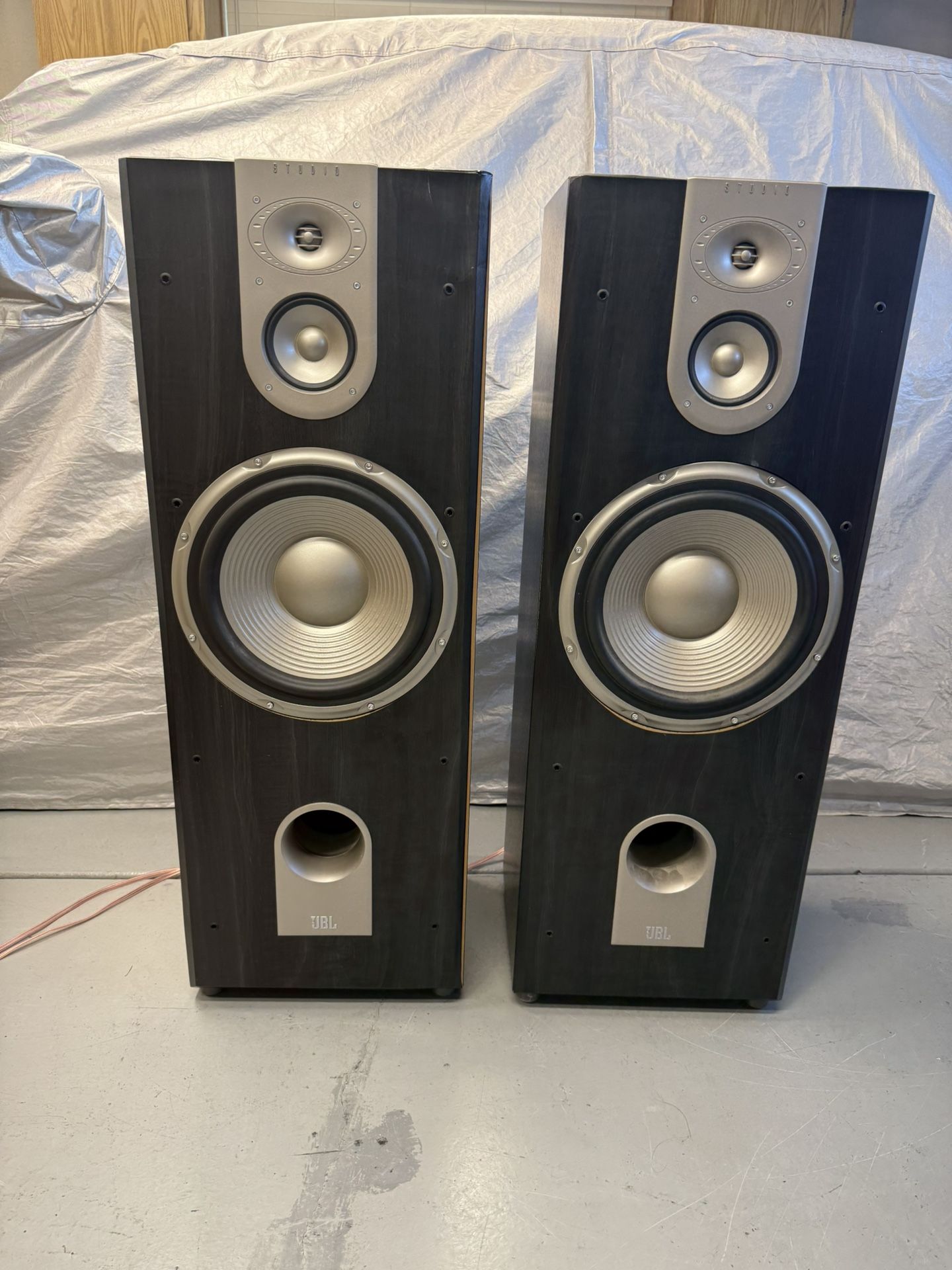 JBL S312II Studio Series 250-Watt 3-Way Speakers (Excellent Condition) • The Speakers are in Excellent Condition and sound Great! • They will be hooked up to a receiver, so you can hear them prior to purchasing The JBL S312II is a 3-way, floorstanding speaker with a 12" PolyPlas woofer, 4" PolyPlas midrange, and 1" titanium dome tweeter, offering a 35Hz-20kHz frequency response, 92dB sensitivity, 8-ohm impedance, and handling up to 250 watts, featuring gold-plated binding posts and designed with EOS waveguide and LFP bezel for clear imaging. Key Specifications: • Type: 3-way, bass-reflex floorstanding speaker • Drivers: o Low-Frequency: 1 x 12" PolyPlas cone o Mid-Range: 1 x 4" PolyPlas cone o High-Frequency: 1 x 1" Pure Titanium Dome with EOS Waveguide • Frequency Response: 35 Hz – 20 kHz (±3dB) • Sensitivity: 92 dB (2.83V/1m) • Impedance: 8 Ohms • Recommended Amplifier Power: Up to 250 watts (max) • Crossover Frequencies: 750 Hz & 3000 Hz • Terminals: Gold-plated, 5-way binding posts • Dimensions (H x W x D): Approx. 41" x 16" x 12.75" • Weight: 77bs per speaker • Features: Video-shielded, Straight-Line Signal Path (SSP) crossover.