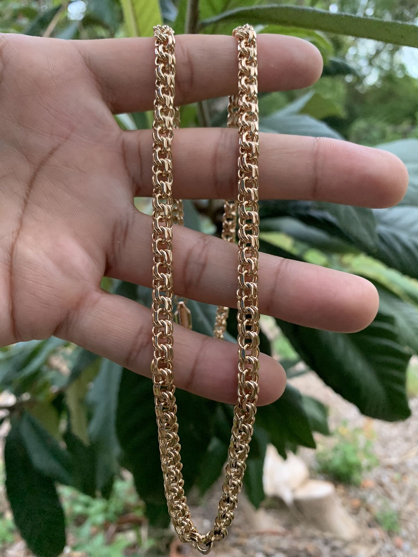 The chain is 24” long & 4mm thick brand new. It’s rose gold mixed with yellow gold. So it has a bronze shine to it . It’s very good quality chain , these don’t fade or turn your neck green like gold plated jewelry does guaranteed. Cadena de tejido chino de 18k oro laminado La cadena mide 24” y 4mm de ancha. Es muy buena calidad que no se despintan como las de oro chapa.
