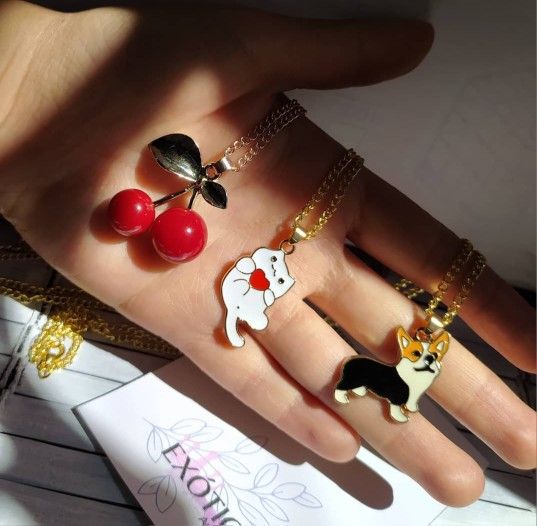 Pendant necklace for women. Never used. I make and design jewelry and accessories. Brass and alloy material 3 different designs: π Kawai kitty π Corgi dog π Cherry Cute gift for a girl or teenager π Some units left. Good discount if you get 2 or more. Cash only