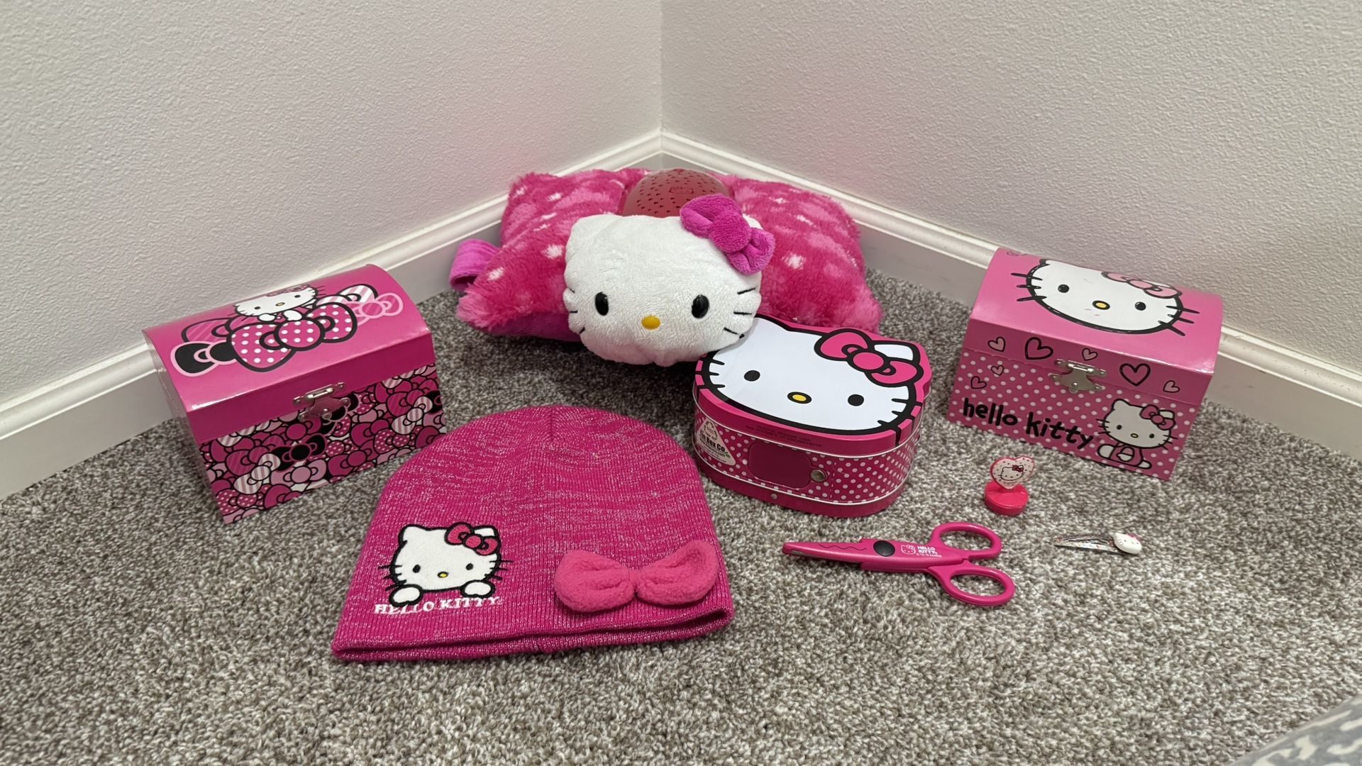 Hello Kitty Bundle β Music Boxes, Pillow Pet, Tin Coin Box, Beanie & Accessories β Great Condition!