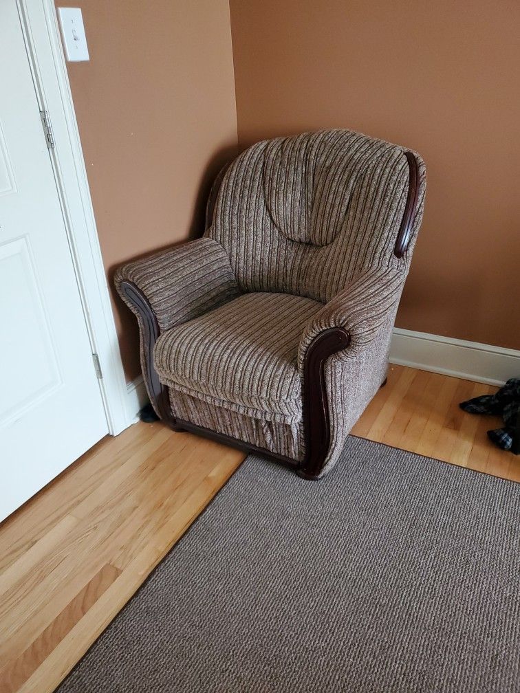 Used. Non smoking home. No pets. Some wear on the arms. See pictures. Wood trim. German made. Springs in seat are very good. No removable cushion.