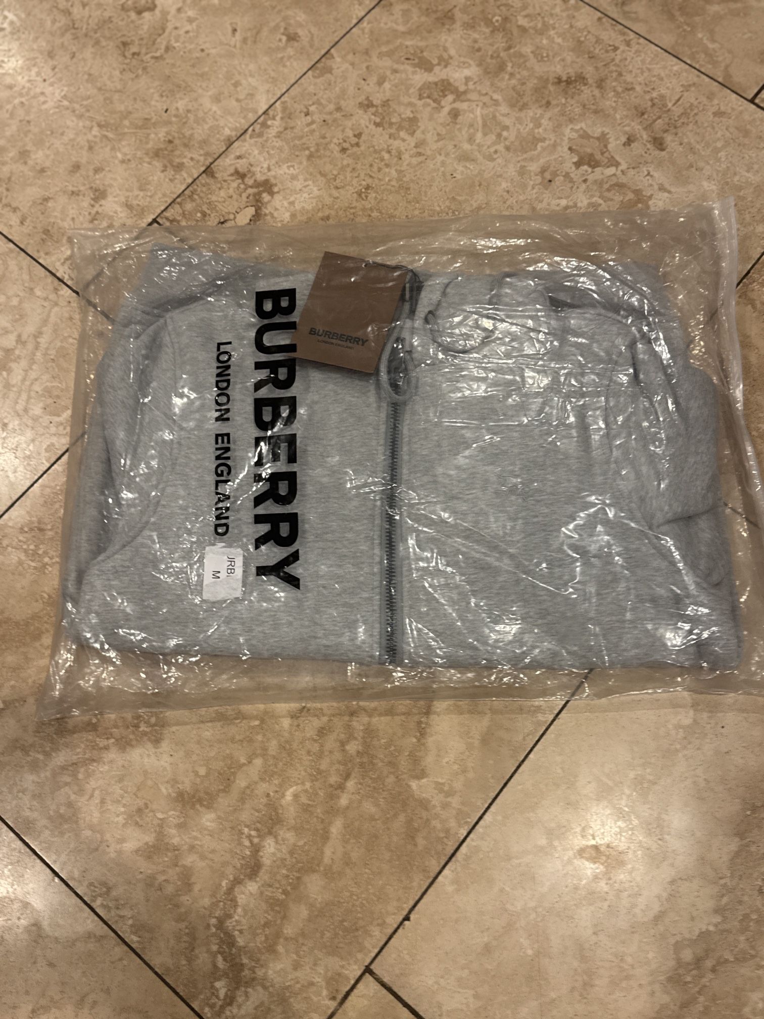 heavyweight hoodie with tags grey color and burberry colorways on the inside Size L runs a little small but still fits L and can possibly fit M